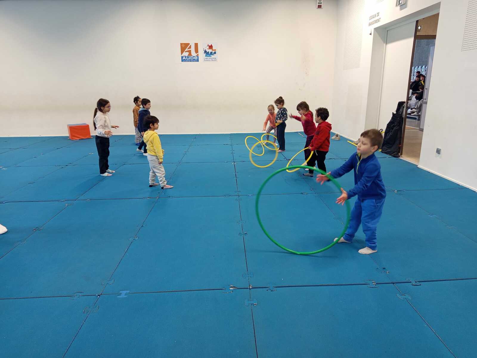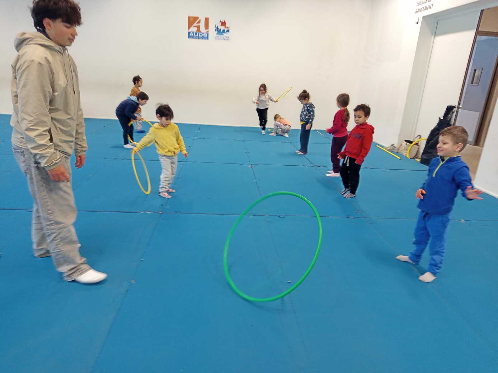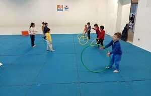 2ème atelier ...lancer de cerceaux ...2 groupes face à face, il fallait qu'ils se lancent le cerceau sans qu'il devient sa trajectoire pour que celui qui est en face le réceptionne et le renvoie pareillement ...exercice pas facile car souvent le cerceau s il est mal lancé part a la dérive !!!(Voir photos qui suivent )