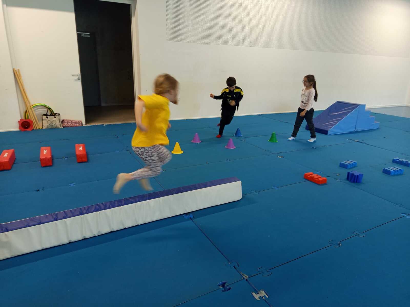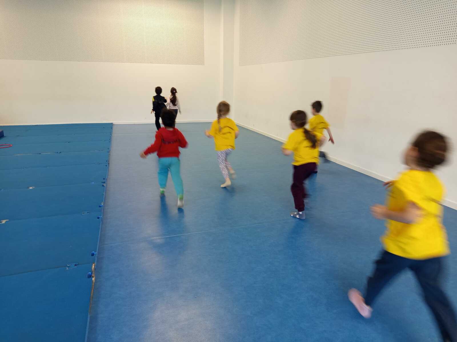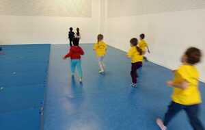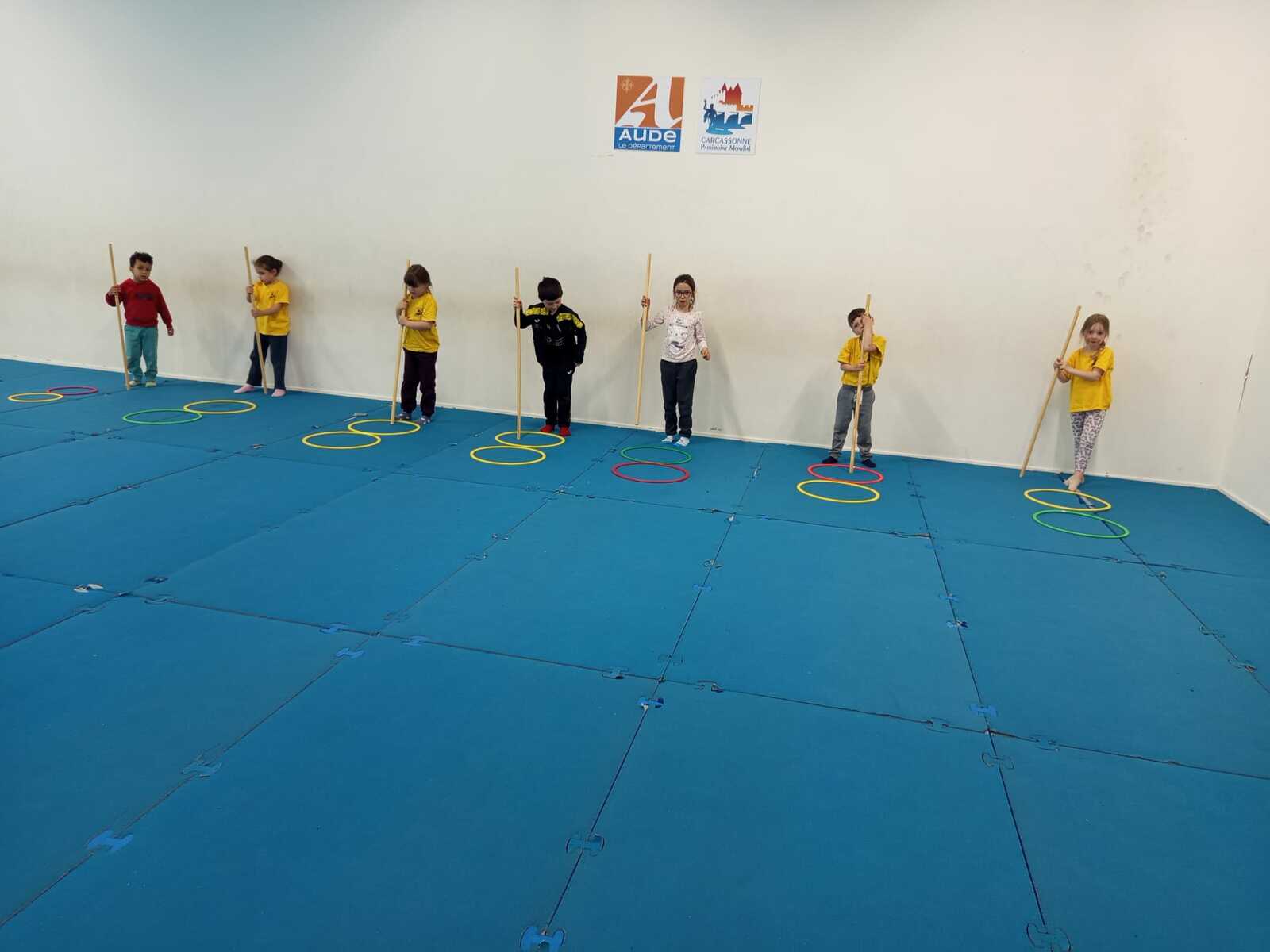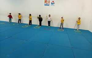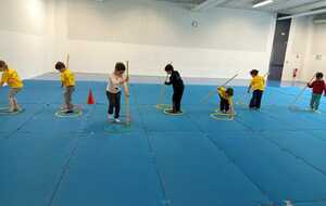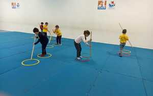 2 ème....la course avec cerceaux. Les jeunes étaient devant 2 cerceaux et tenait un jalon. Au top départ chaque jeune sautait dans le 1er cerceau puis dans le 2eme et avec l aide du jalon il faisait avancer le cerceau qui était derrière lui et le passait devant et ainsi de suite jusqu'à la ligne d'arrivée délimitée par des plots .et ensuite ils revenaient au point de départ pareillement. Cela a été fait plusieurs fois afin de s'améliorer dans la vitesse et également dans l' ordre d 'arrivée .