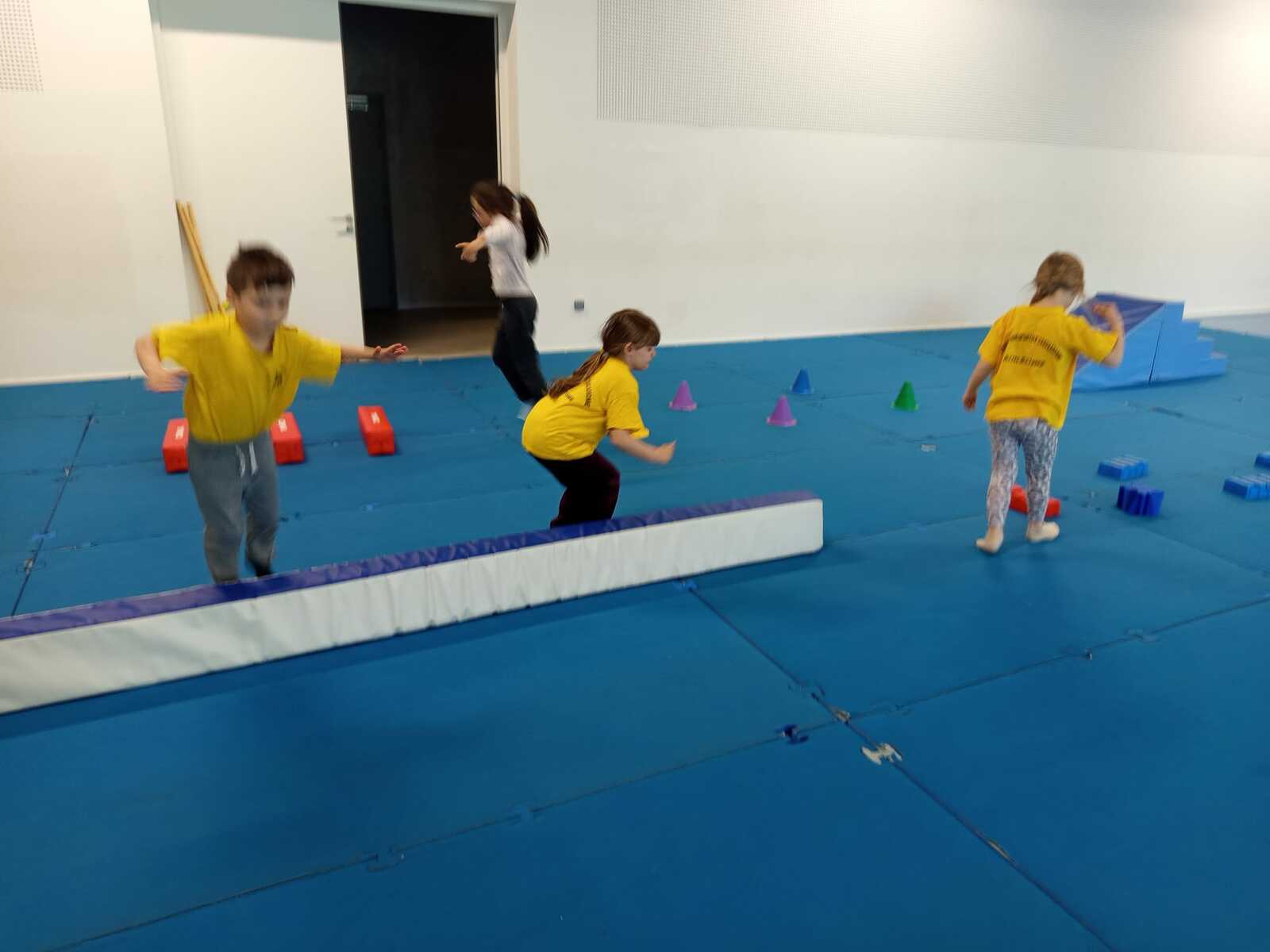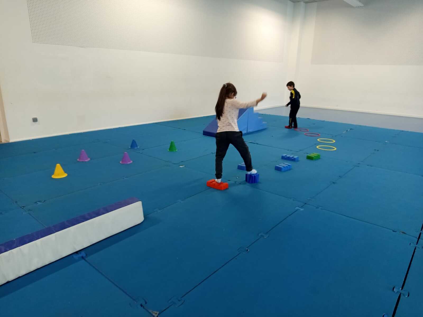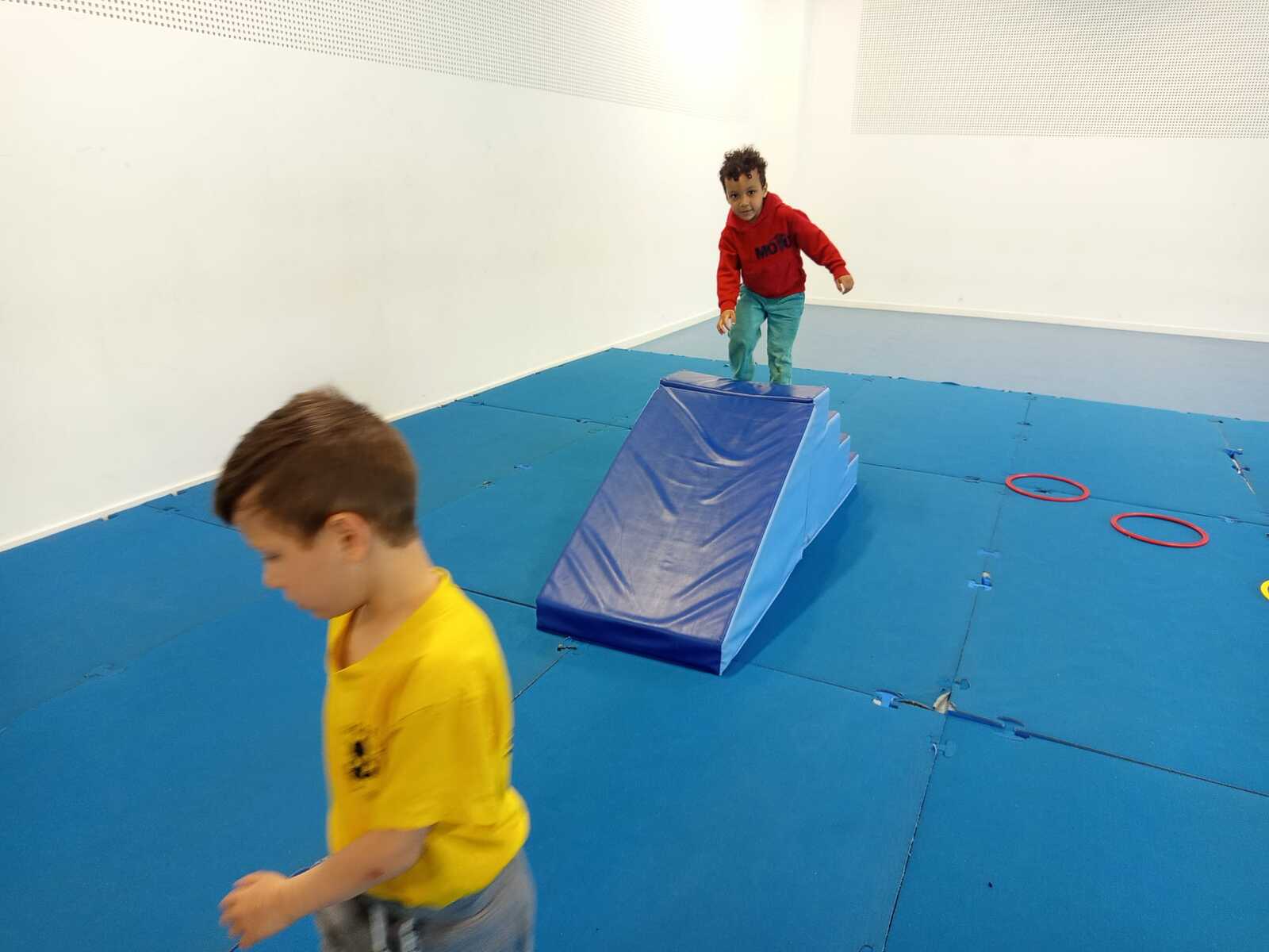 2 ème....la course avec cerceaux. Les jeunes étaient devant 2 cerceaux et tenait un jalon. Au top départ chaque jeune sautait dans le 1er cerceau puis dans le 2eme et avec l aide du jalon il faisait avancer le cerceau qui était derrière lui et le passait devant et ainsi de suite jusqu'à la ligne d'arrivée délimitée par des plots .et ensuite ils revenaient au point de départ pareillement. Cela a été fait plusieurs fois afin de s'améliorer dans la vitesse et également dans l' ordre d 'arrivée .