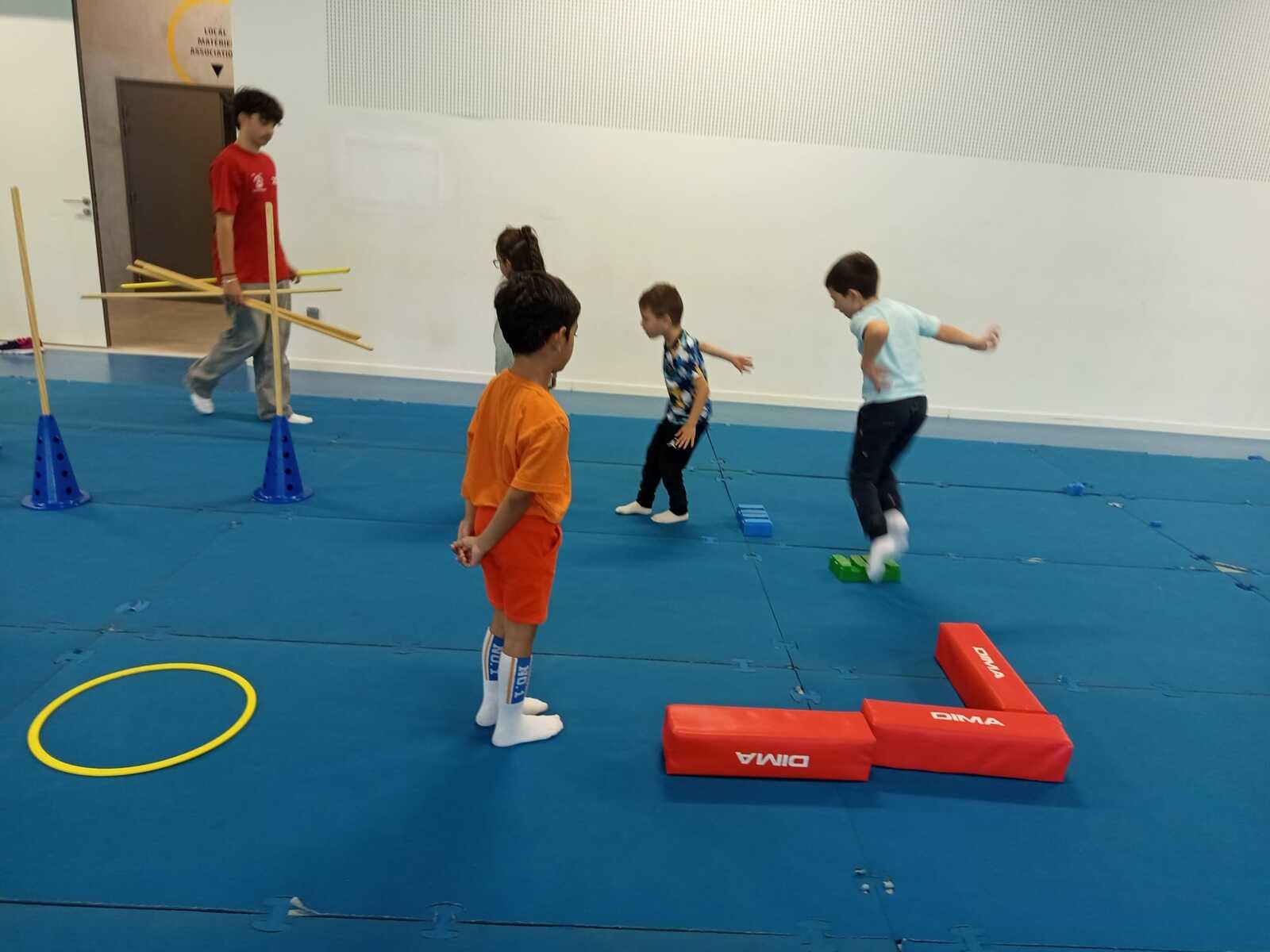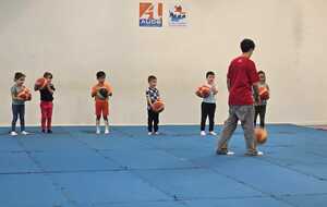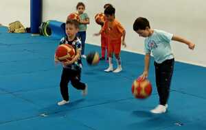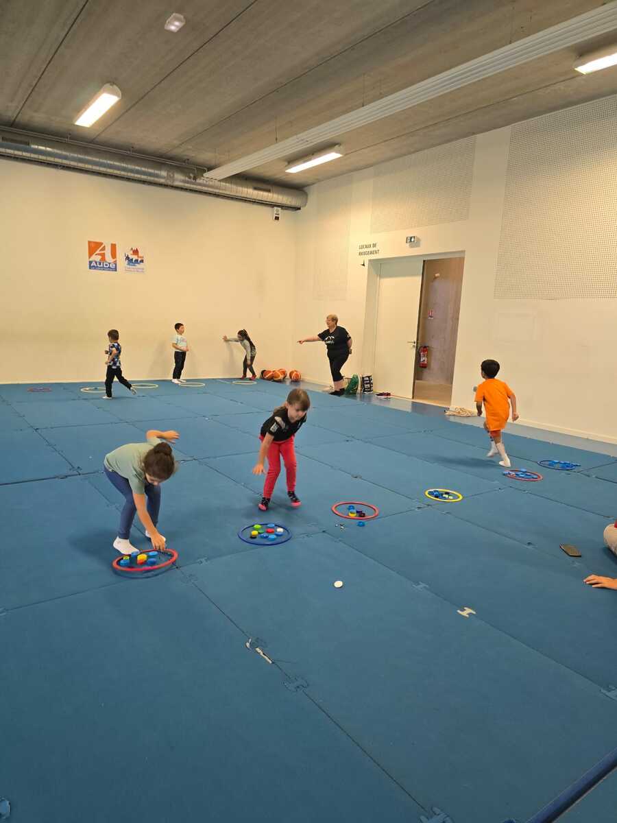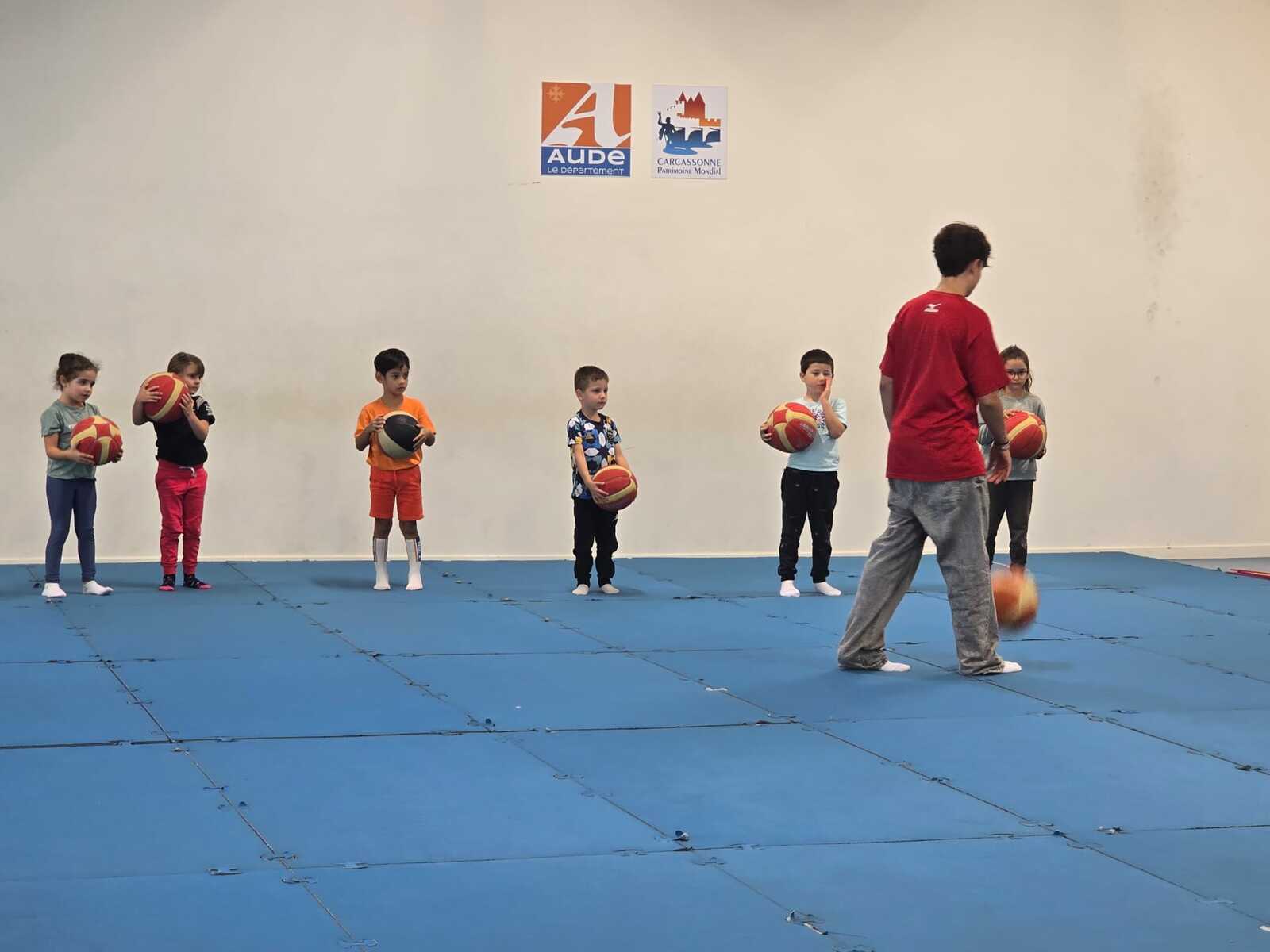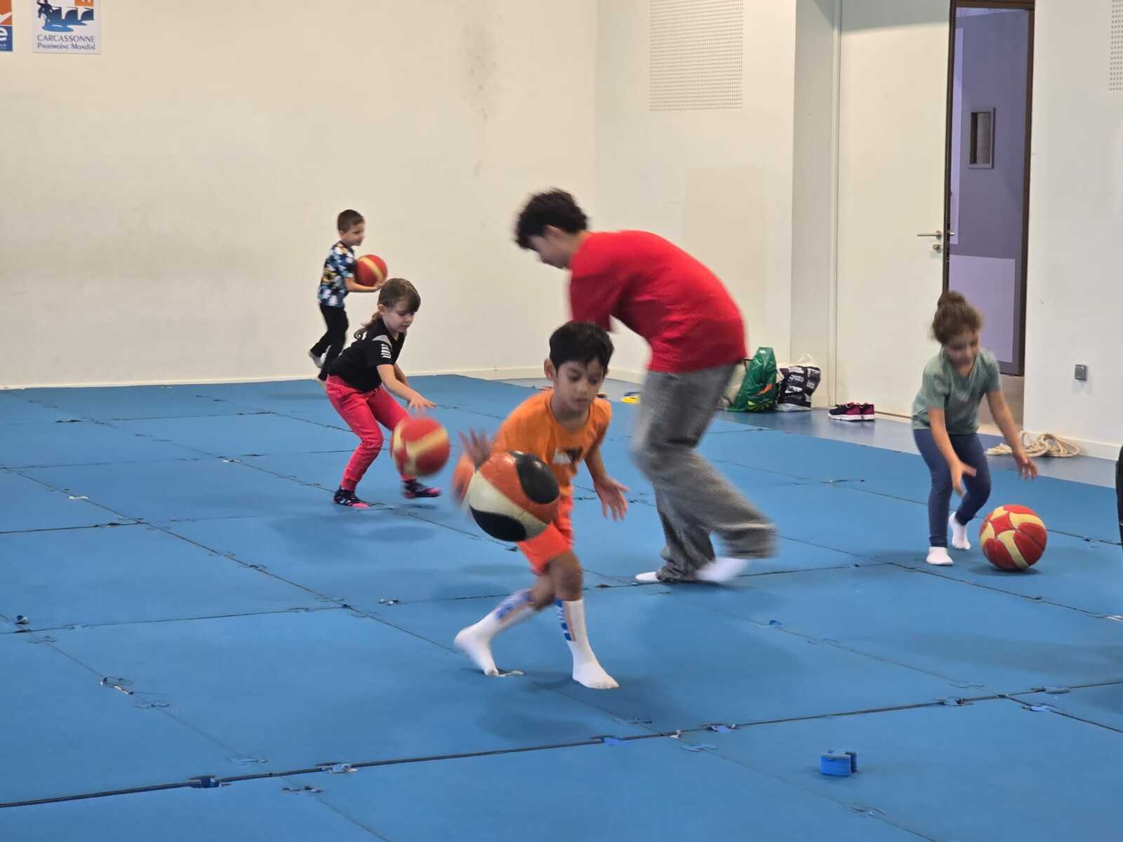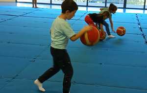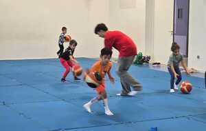 3 eme atelier courir avec un ballon de basket en le faisant rebondir a l aide d' une main ...pas toujours facile mais pour une première ils se sont bien débrouillés !👏