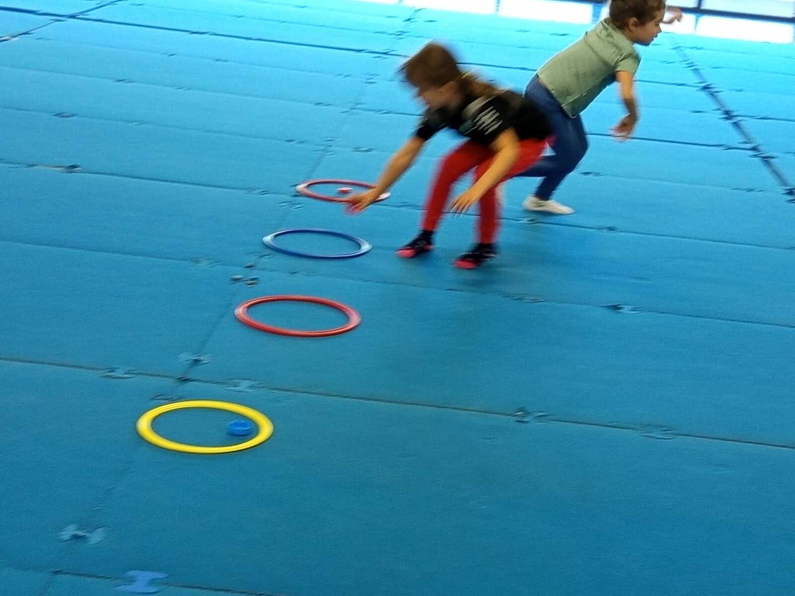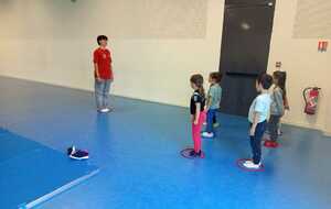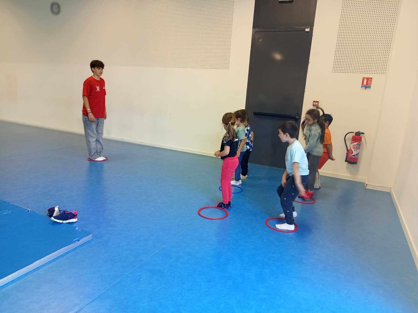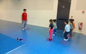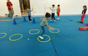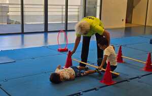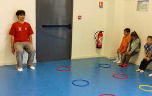 Chaque jeune avait 12 bouchons dans un cerceau et au top départ donné par Loan il fallait que chacun prenne un seul bouchon et courir le déposer dans un cerceau face à eux jusqu'au dernier bouchon ...attention il ne fallait pas se tromper de cerceau!!!