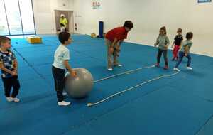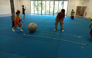 2 ème atelier : Lancer 2 equipes ... il fallait s envoyer un gros ballon entre 2 cordes sans le faire sortir de sa trajectoire ( voir photos qui suivront )