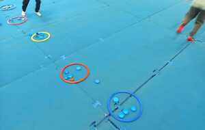 Le 1er qui avait mis tous les bouchons dans son cerceau en face avait gagné...cela a été fait plusieurs fois pour améliorer la vitesse et déposer le plus de bouchons en face .