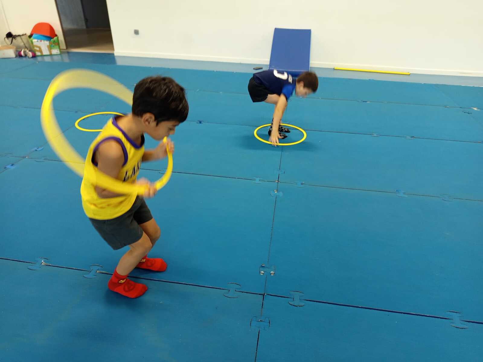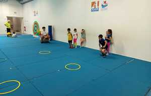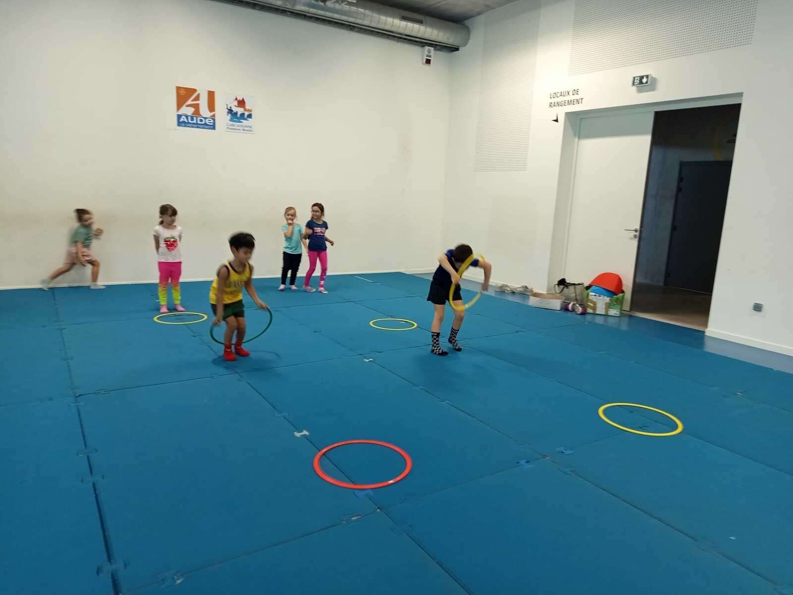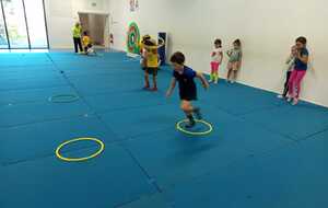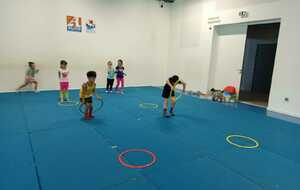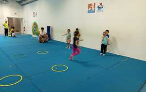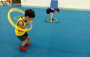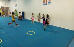 3 eme atelier : le relais. 2 équipe de 3 avec en face et espaces 5 cerceaux.Au top départ donne par Loan le 1er de chaque équipe partait en courant prenait le 1er cerceau le passait de la tête au pied, laisser sur place le cerceau et partait jusqu'au 2 ème cerceau et faisait de même et cela jusqu'au 5 ème, puis partait en courant vers son équipe tapait la main du 2ème qui refaisait le même parcours et cela jusqu'au dernier de l'équipe. La premier equipe qui finissait marquait 1 point