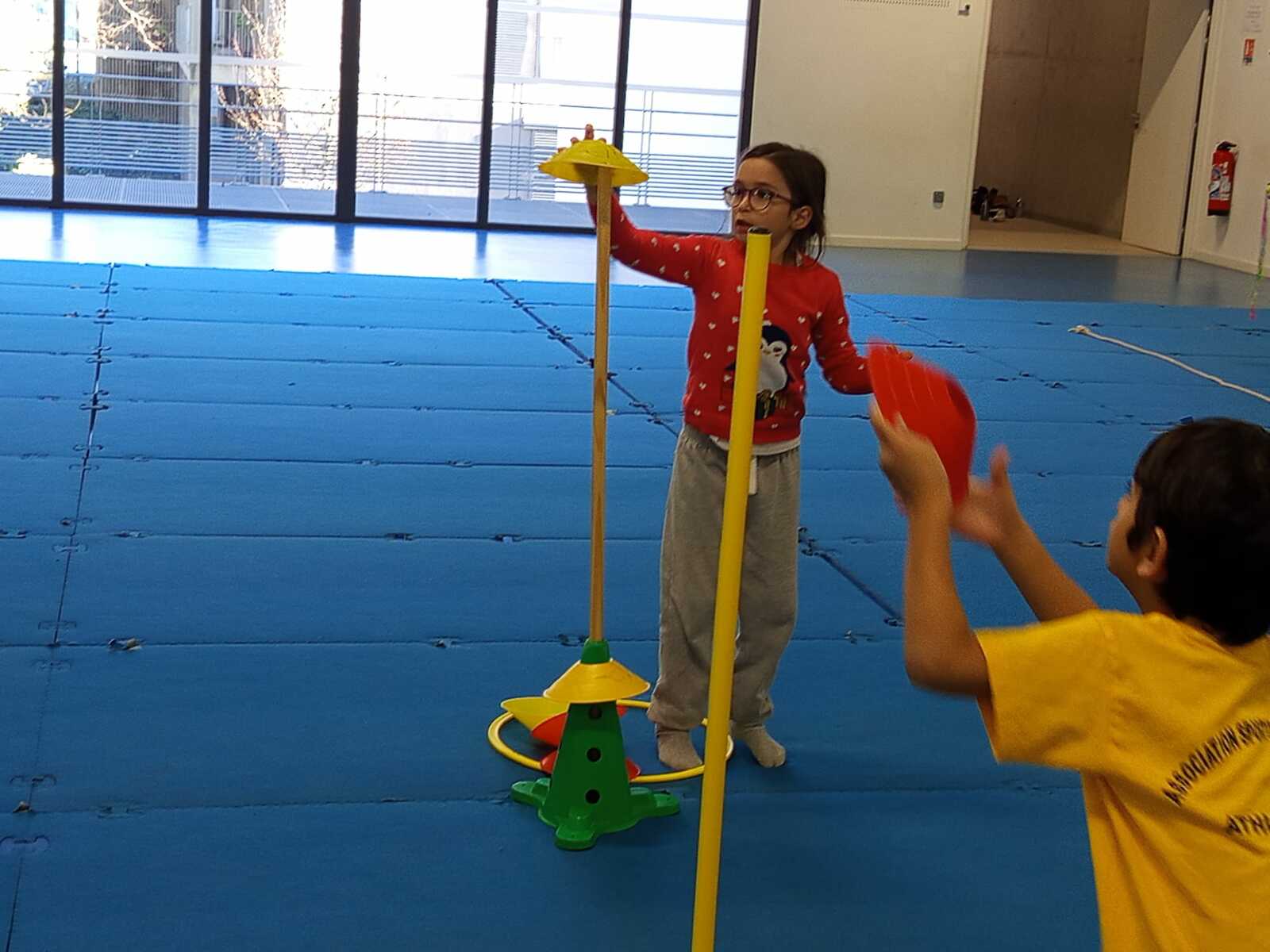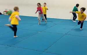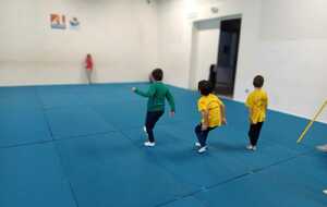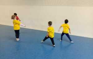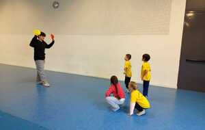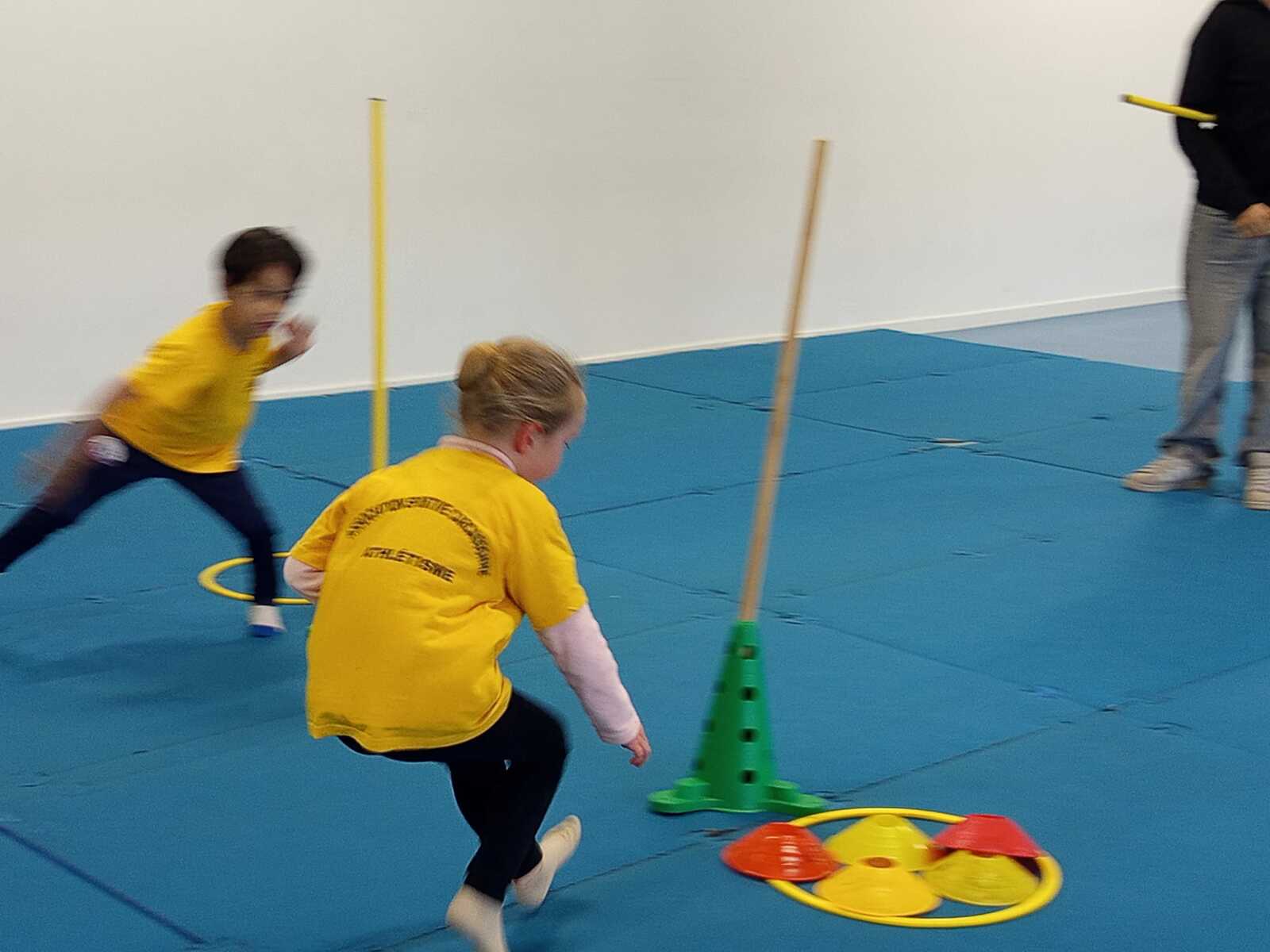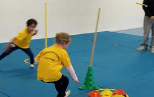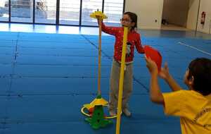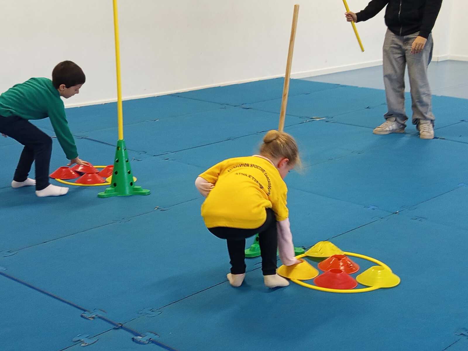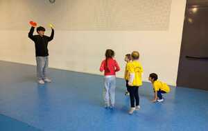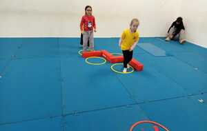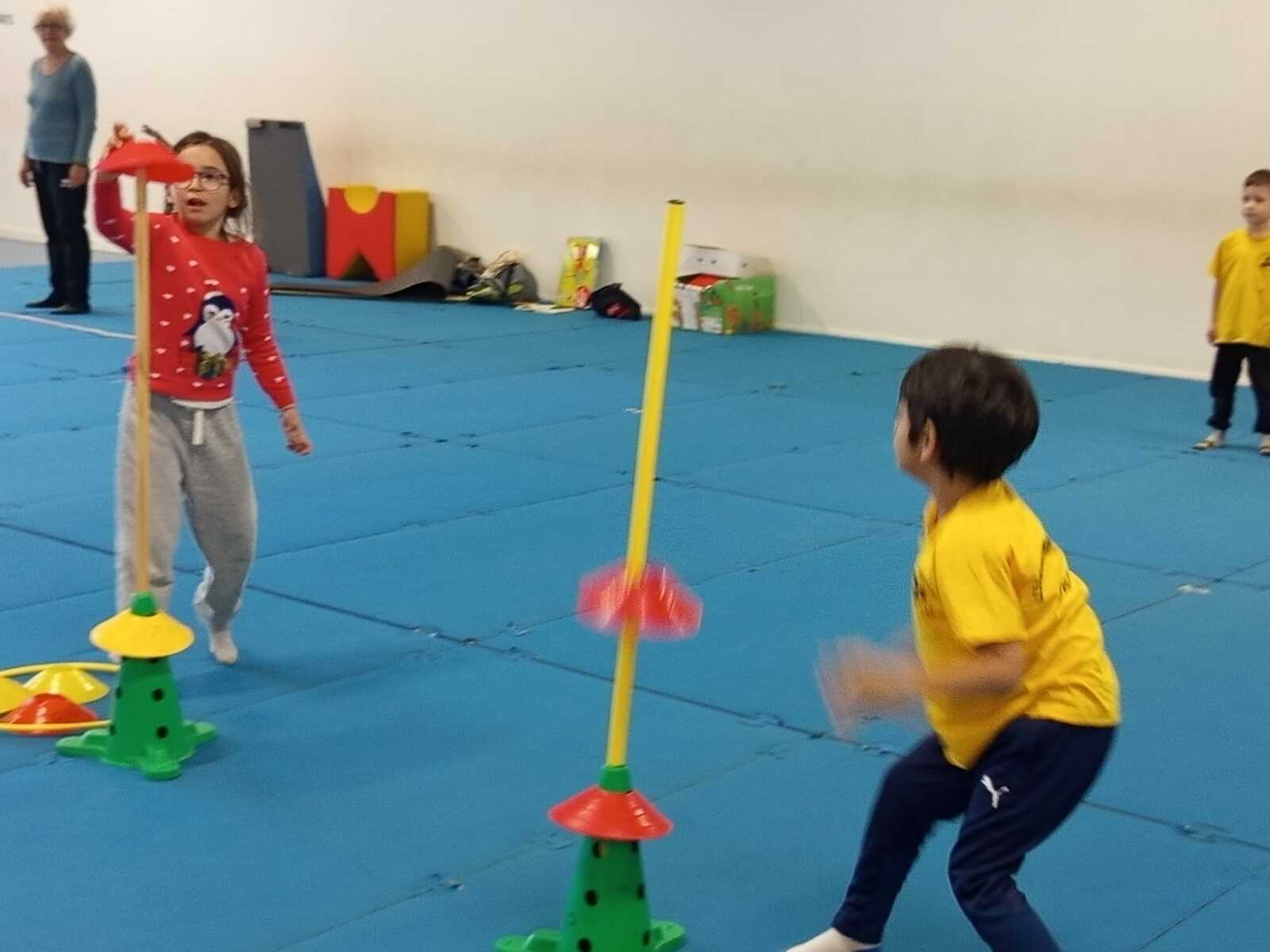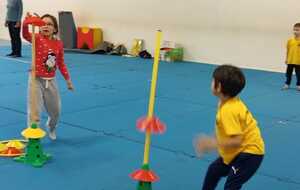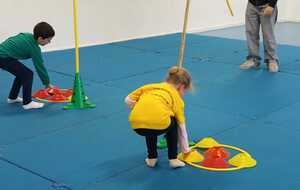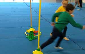 2ème atelier...relais coupelles : 2 petits groupes. Au top départ de Loan chaque 1er devait partir en courant et devant eux à une certaine distance il y avait un plot avec un jalon et à côté un cerceau avec des coupelles, chacun devait prendre 1 coupelle du cerceau et l'enfiler au jalon et vite repartir taper la main du 2ème qui a son tour de faire pareil et cela jusqu'à ce qu'il ne reste plus de coupelle dans le cerceau. Le 1er groupe qui terminait marquait 1 point. Cela a été fait 4 fois pour améliorer leurs scores.