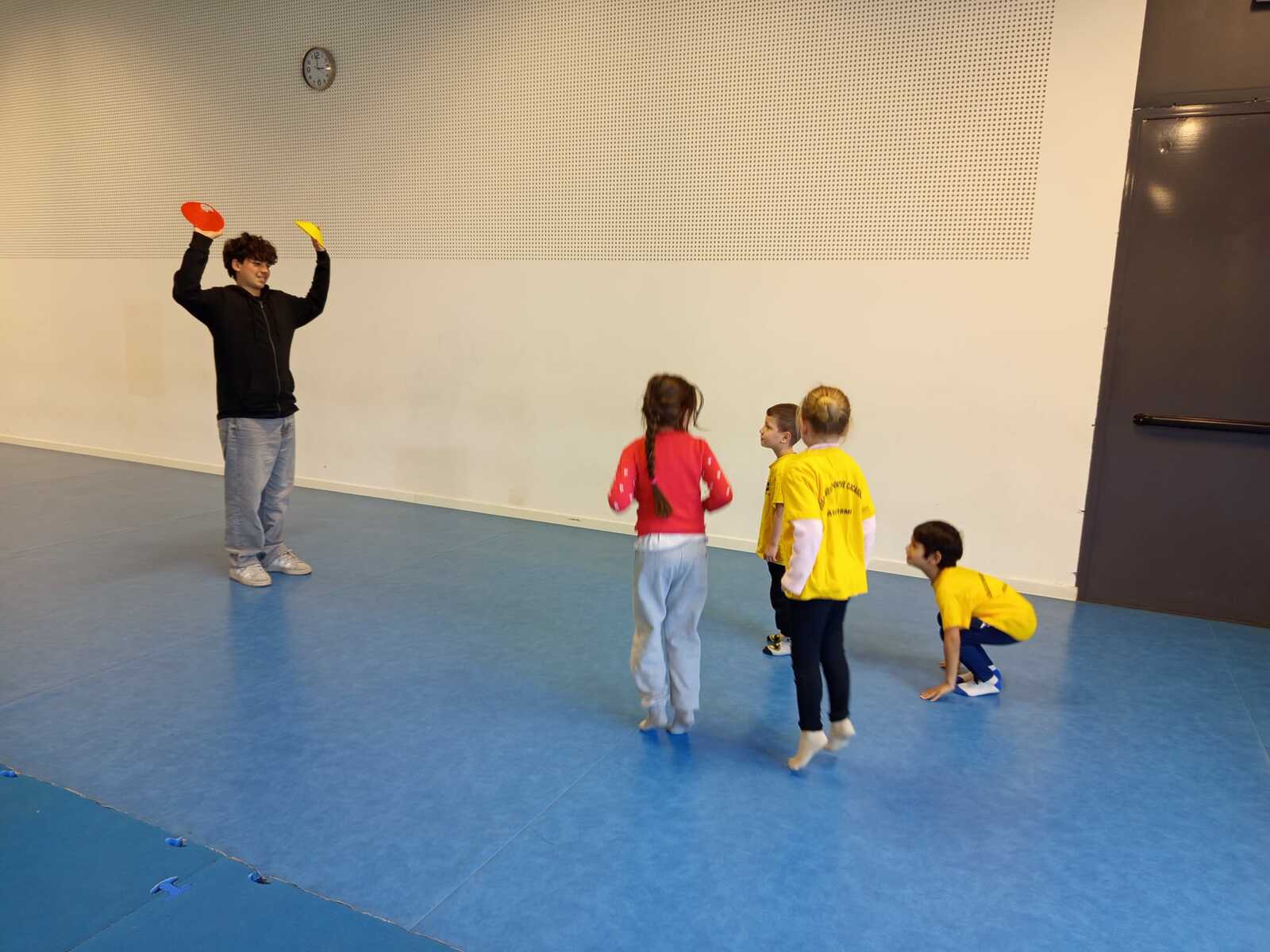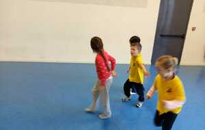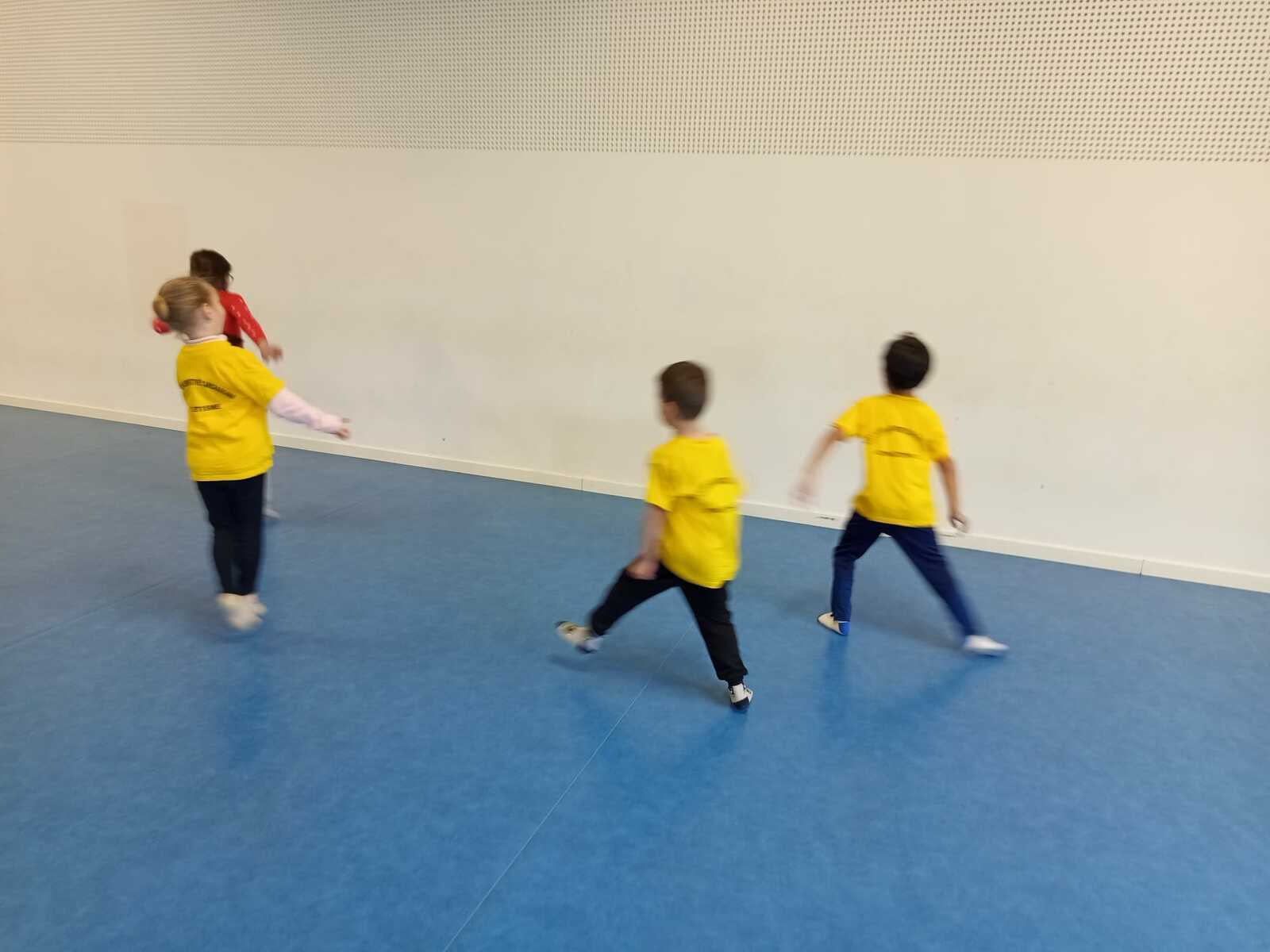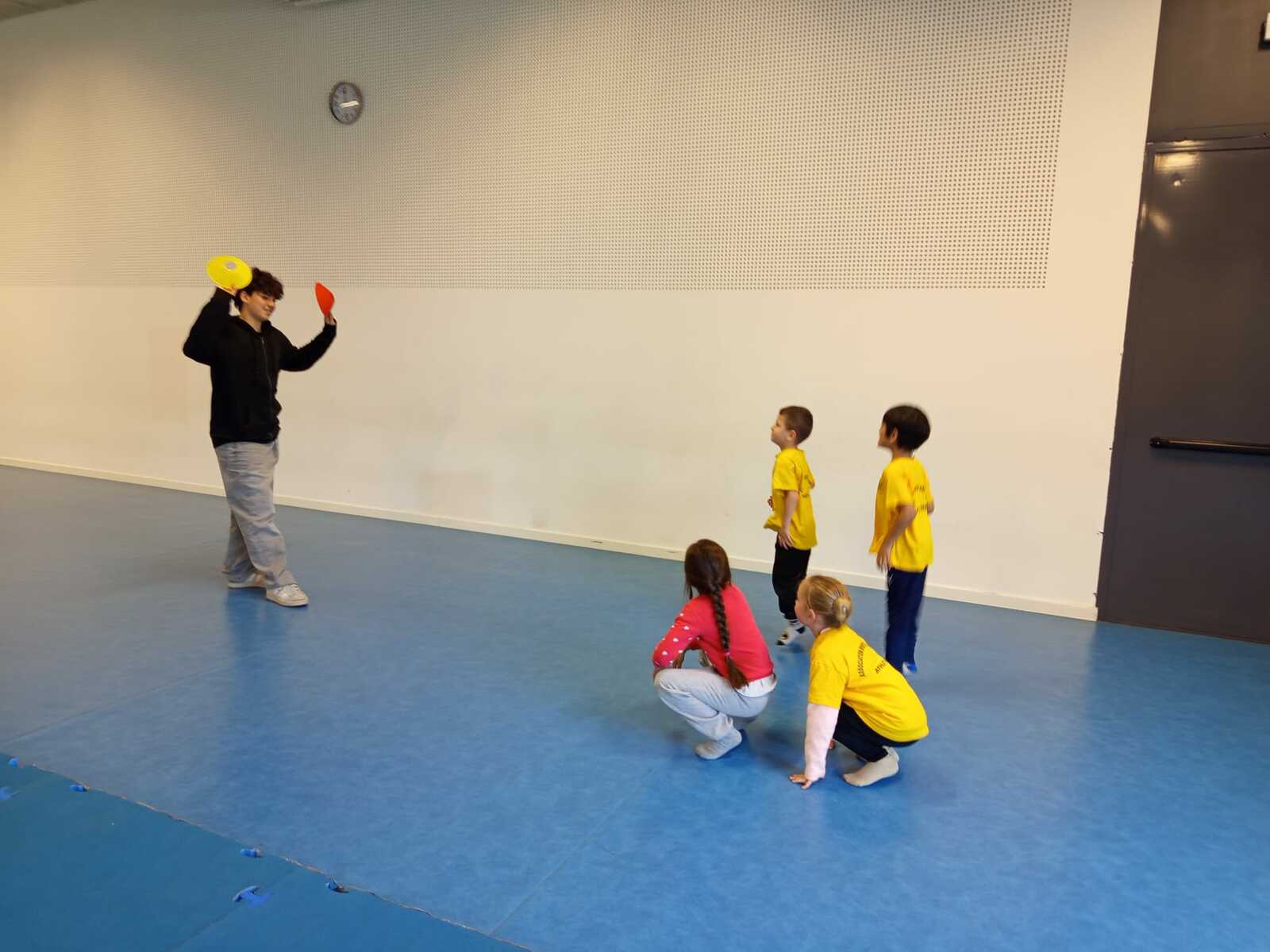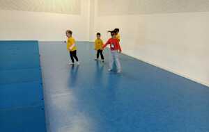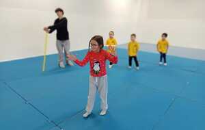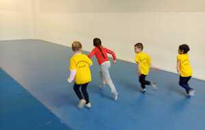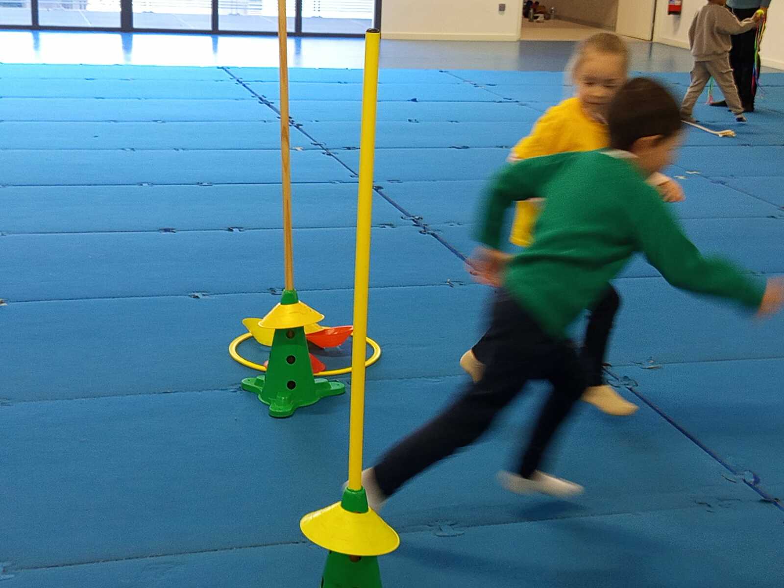 2ème atelier...relais coupelles : 2 petits groupes. Au top départ de Loan chaque 1er devait partir en courant et devant eux à une certaine distance il y avait un plot avec un jalon et à côté un cerceau avec des coupelles, chacun devait prendre 1 coupelle du cerceau et l'enfiler au jalon et vite repartir taper la main du 2ème qui a son tour de faire pareil et cela jusqu'à ce qu'il ne reste plus de coupelle dans le cerceau. Le 1er groupe qui terminait marquait 1 point. Cela a été fait 4 fois pour améliorer leurs scores.