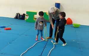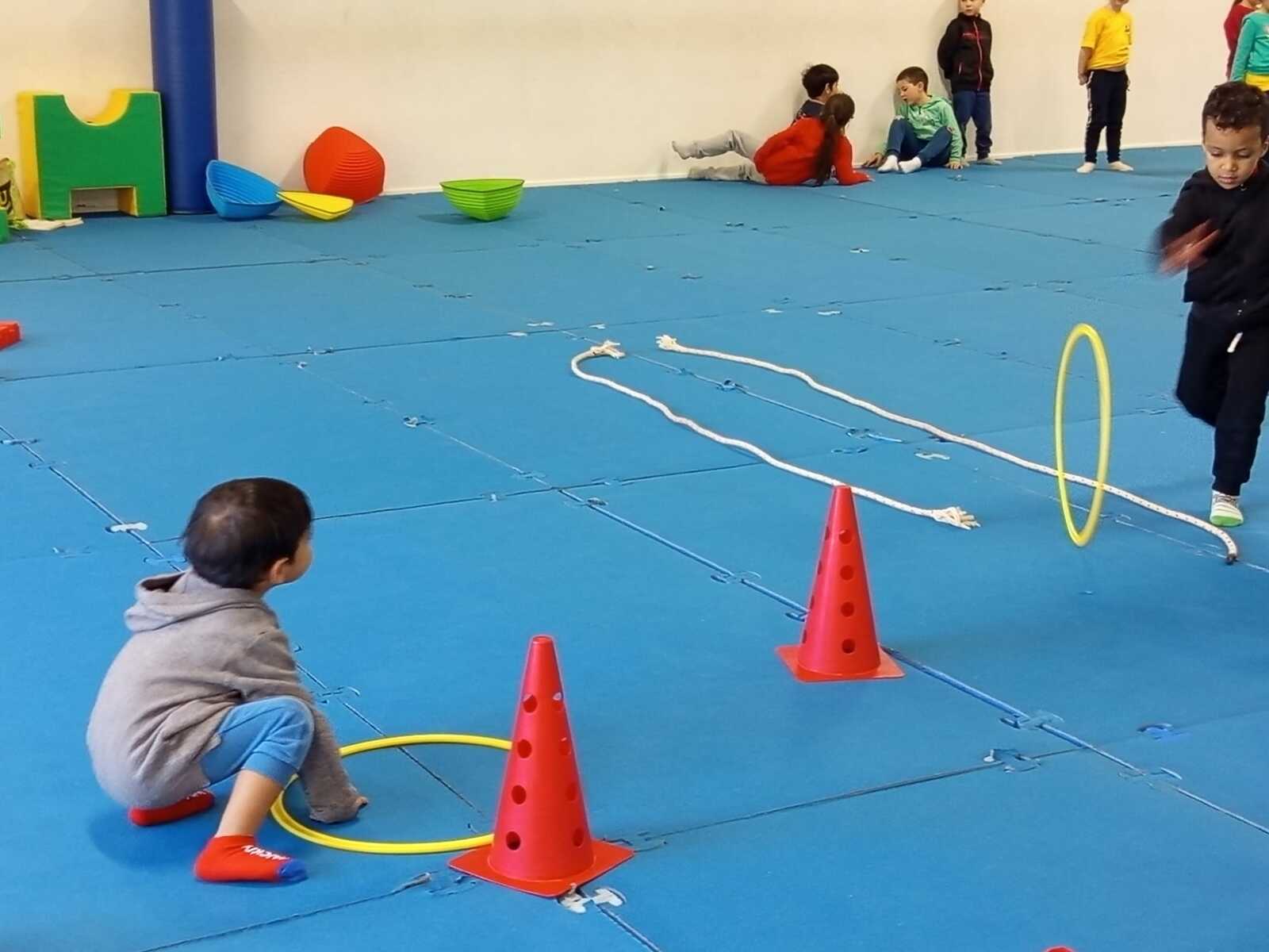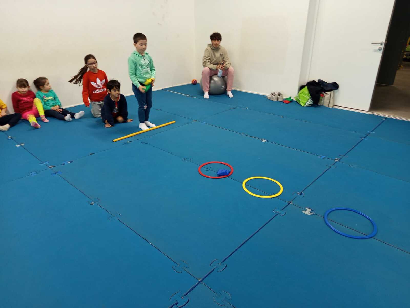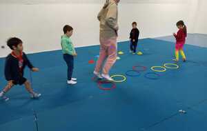 2 ème atelier : lancer. Il fallait lancer chacun trois sacs de graines dans 3 cerceaux espacés et suivant si c était le 1 et ...ça donnait 1 point. Le 2 ème ..2 points. Le 3 ème ...3 points. Et cela plusieurs fois afin d'améliorer les lancers et les points