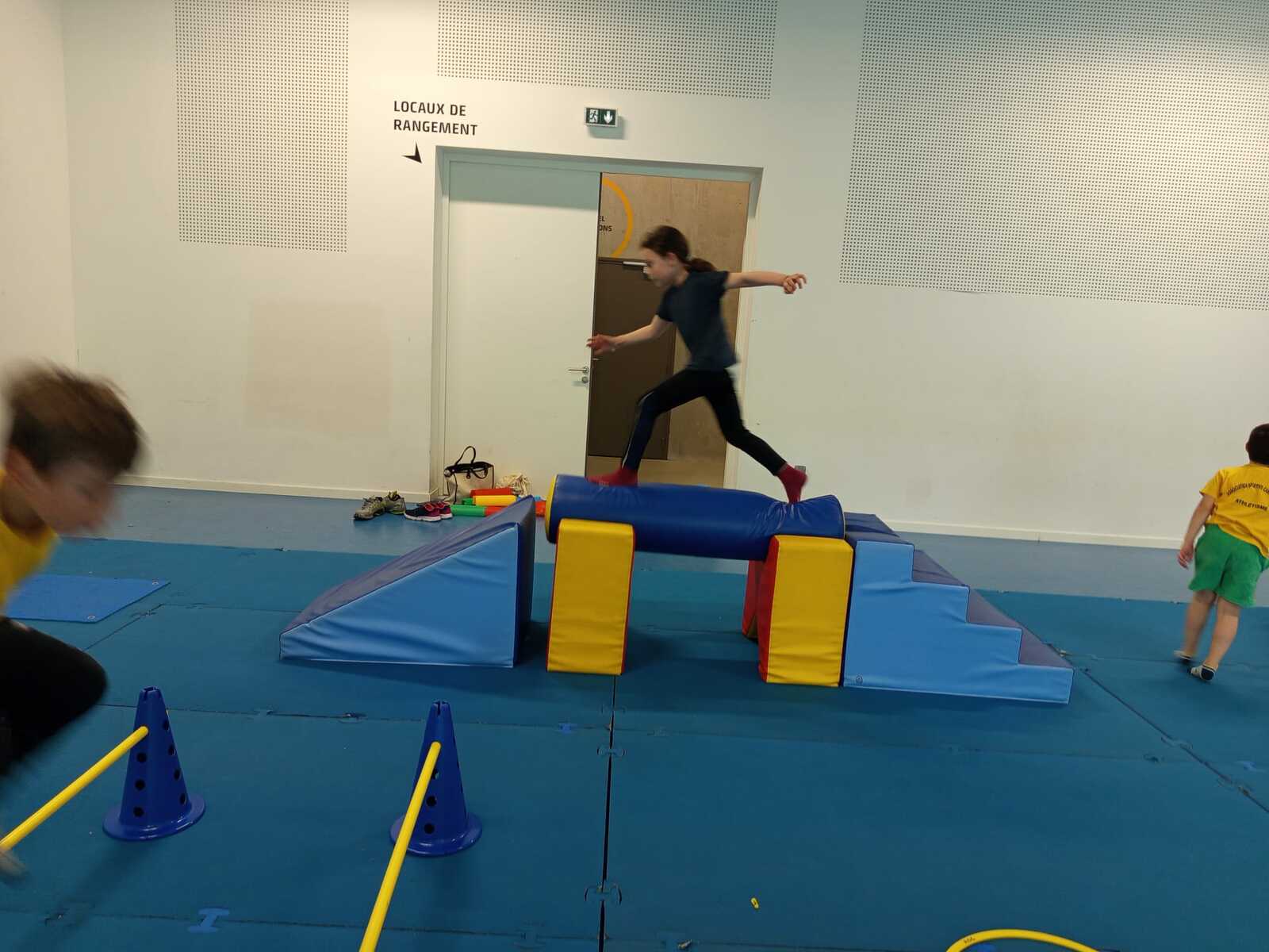 3ème atelier : course. En individuel chacun devant un cerceau et au top départ il fallait aller récupérer le 1er plot et le ramener dans son cerceau repartir chercher l'autre plot revenir et ainsi de suite jusqu'à ce que les 4 plots qui étaient espaces de plus en plus loin soient ramenés dans leur cerceau. Même Loan a voulu jouer le jeux avec eux pour les pousser a se dépasser car bien sûr ils voulaient essayer de le battre ...belle course pour tous 👏