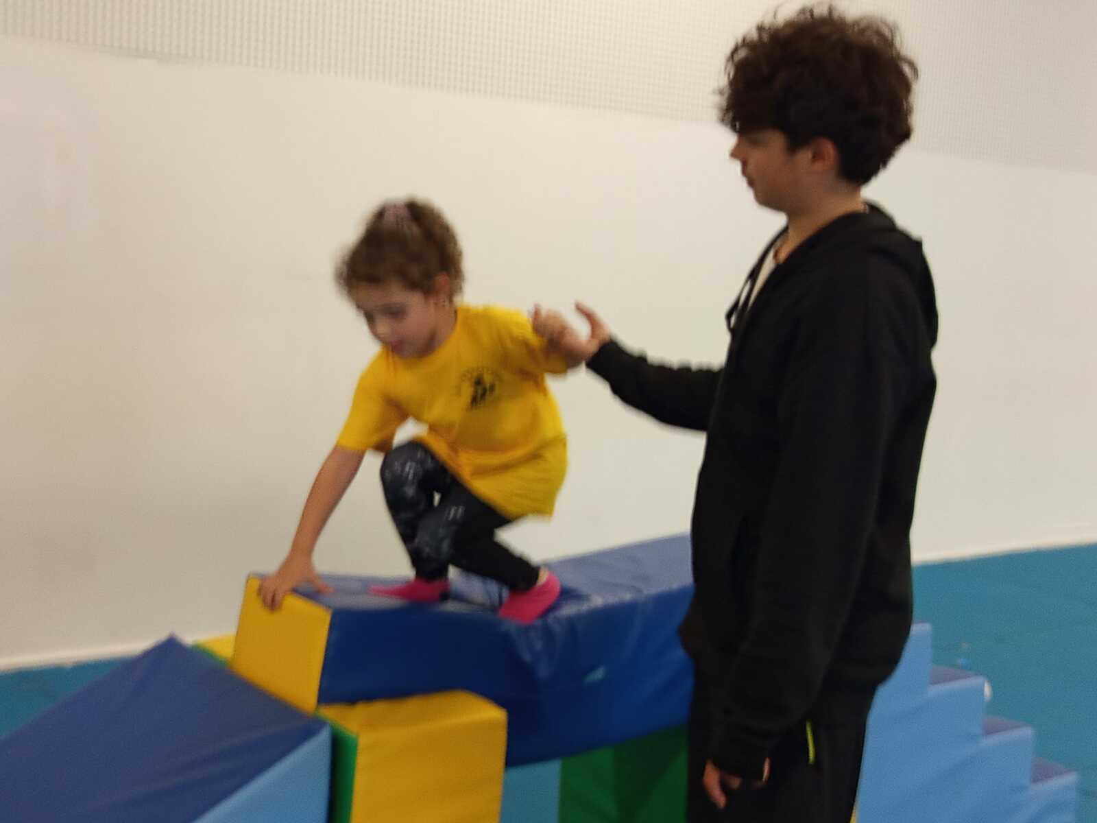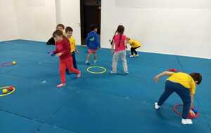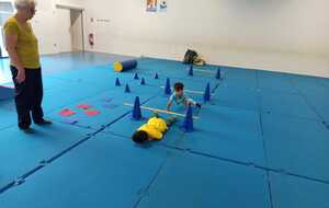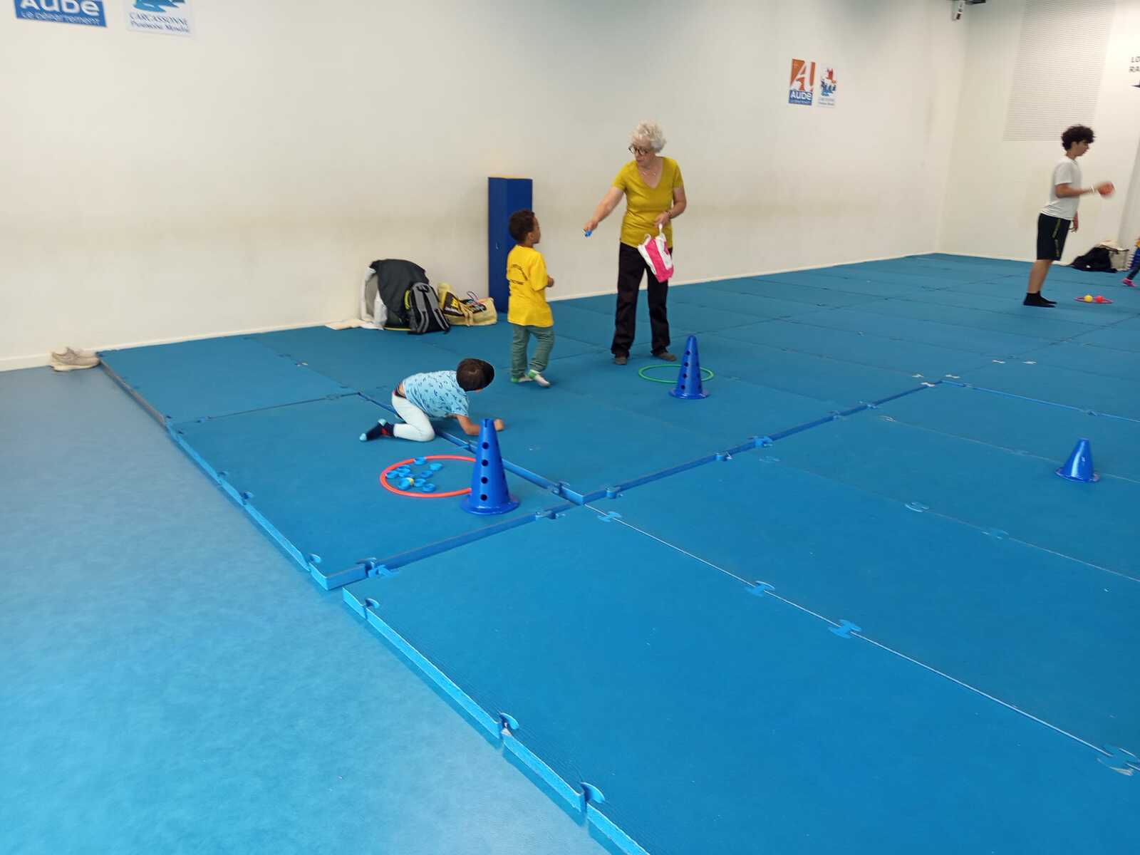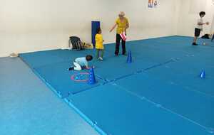 2 ème atelier : lancer de cerceau sur plots. Chaque jeune devait lancer un cerceau sur un plot en face lui et cela plusieurs fois, toujours pas facile à réussir car il faut de l'adresse et de la précision mais certains y sont parvenus 👏