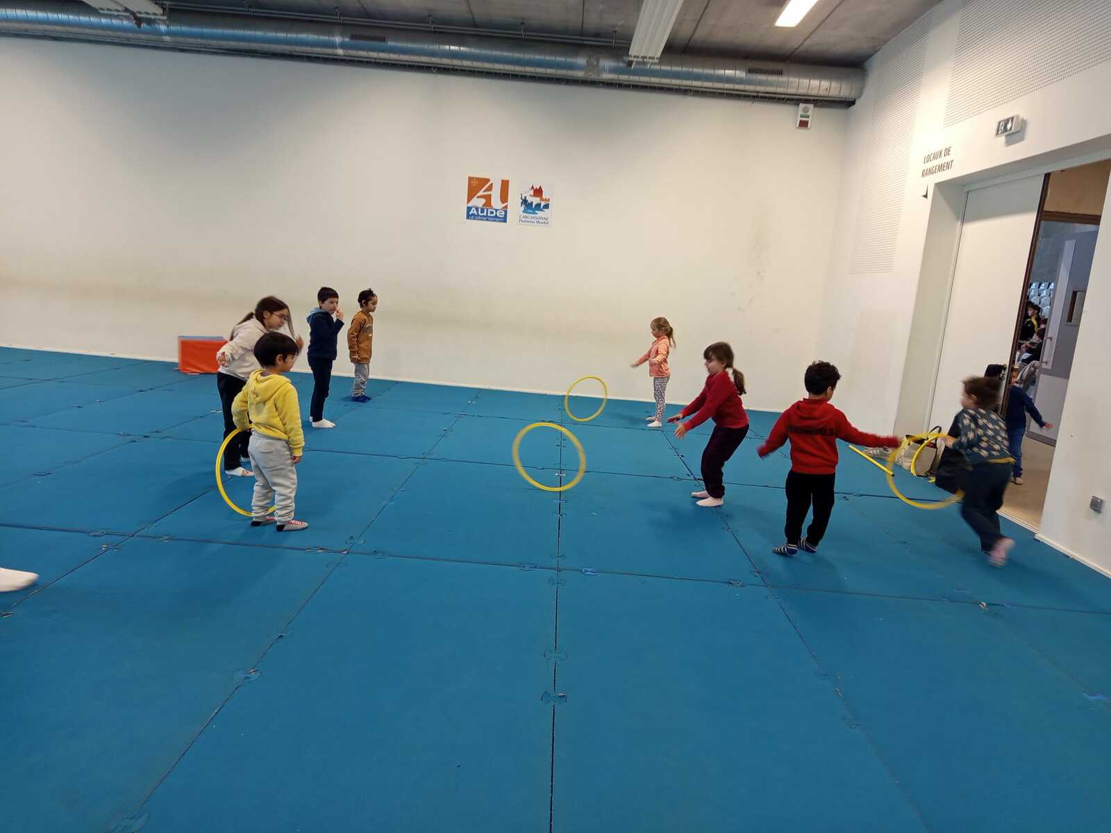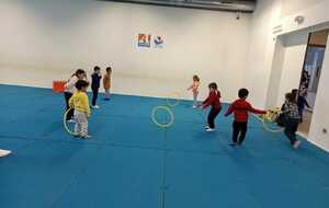 2ème atelier ...lancer de cerceaux ...2 groupes face à face, il fallait qu'ils se lancent le cerceau sans qu'il devient sa trajectoire pour que celui qui est en face le réceptionne et le renvoie pareillement ...exercice pas facile car souvent le cerceau s il est mal lancé part a la dérive !!!(Voir photos qui suivent )