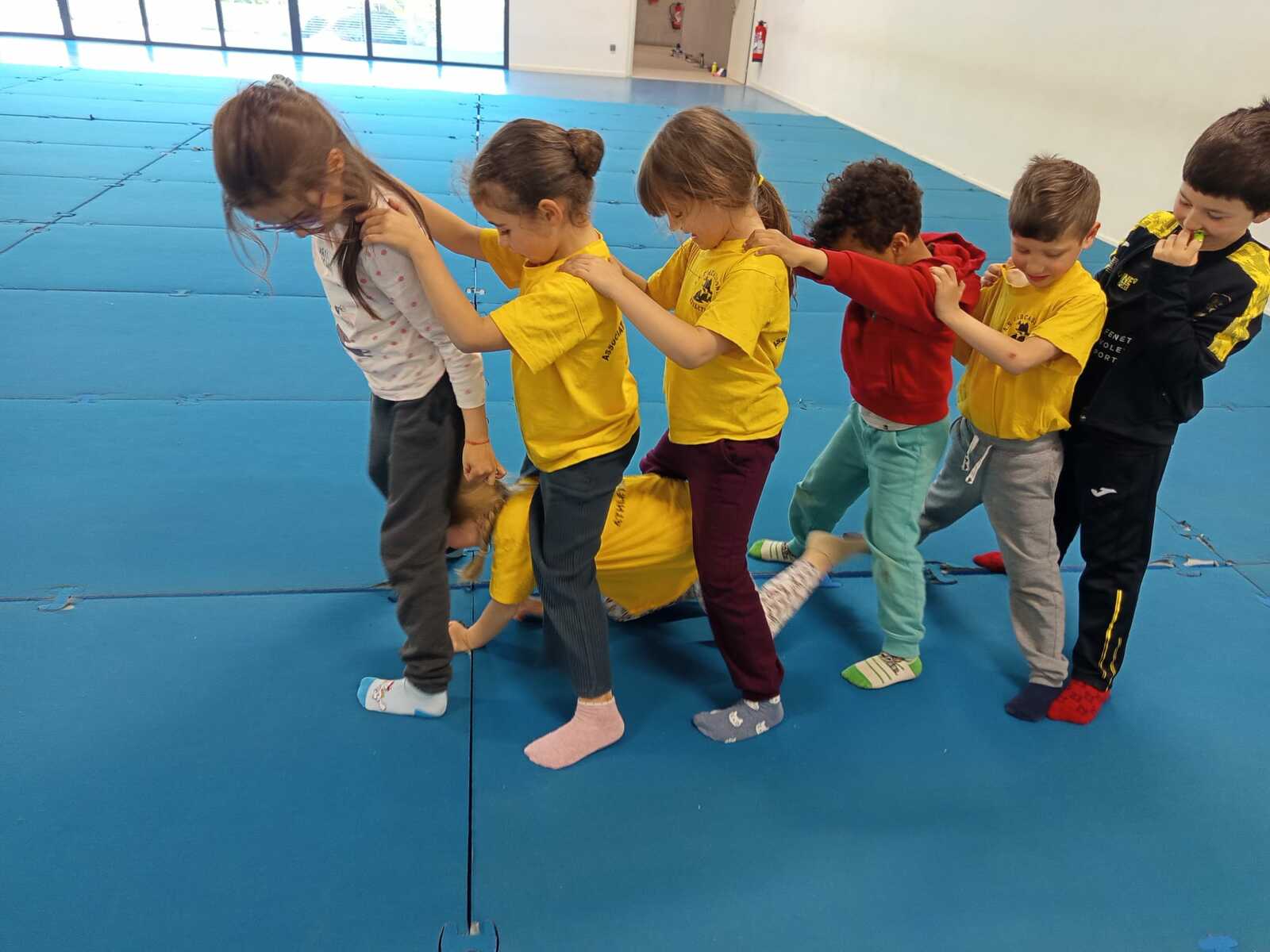 3ème ....le pont roulant. Un derrière l'autre en se tenant par les épaules et les jambes les écartées. Au top départ le dernier se détachait et passait entre les jambes de l'équipe (sous le pont ) pour se placer devant les jambes écartées et celui qui était premier lui mettait les mains sur les épaules du temps que l autre de derrière passait entre les jambes pour rejoindre le premier et tout s' enchainait pareillement jusqu 'a la reconstitution de la file du départ, d'où le nom "pont roulant".