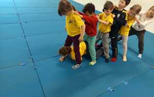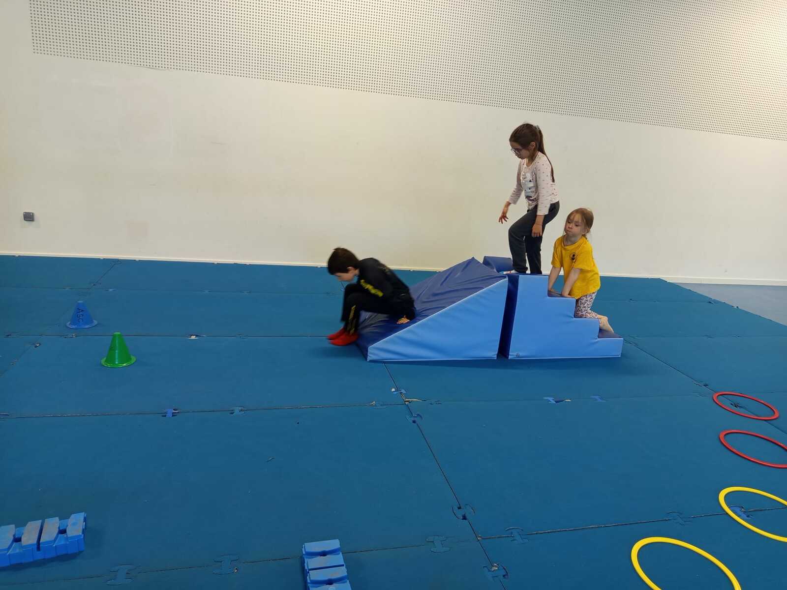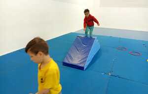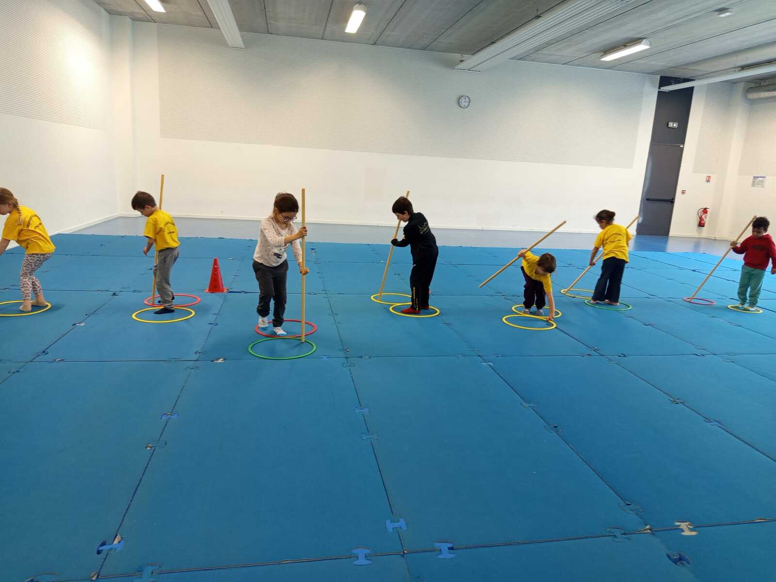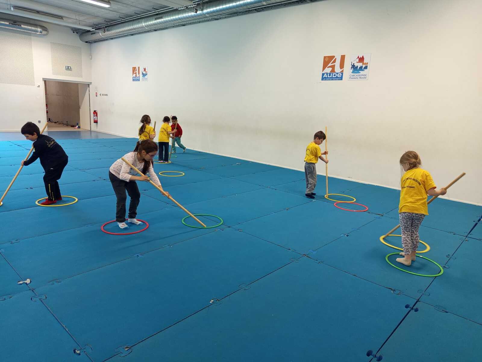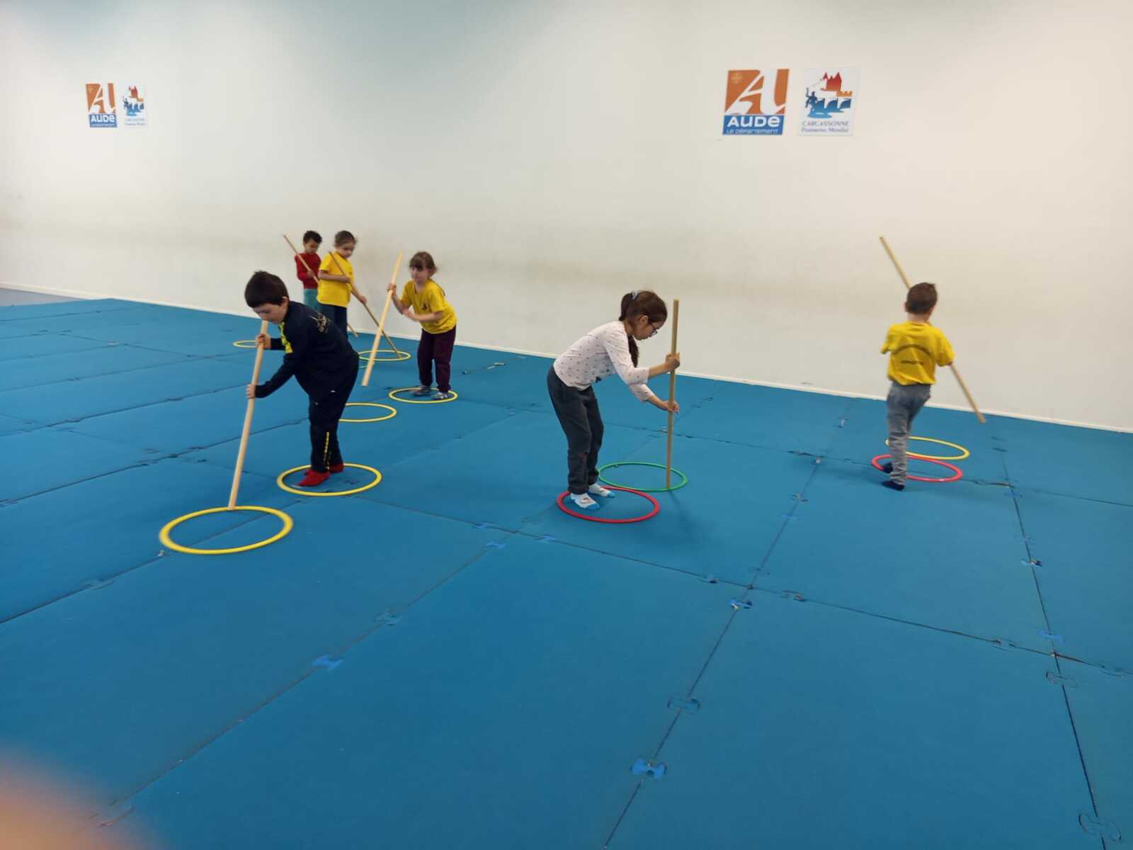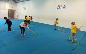 2 ème....la course avec cerceaux. Les jeunes étaient devant 2 cerceaux et tenait un jalon. Au top départ chaque jeune sautait dans le 1er cerceau puis dans le 2eme et avec l aide du jalon il faisait avancer le cerceau qui était derrière lui et le passait devant et ainsi de suite jusqu'à la ligne d'arrivée délimitée par des plots .et ensuite ils revenaient au point de départ pareillement. Cela a été fait plusieurs fois afin de s'améliorer dans la vitesse et également dans l' ordre d 'arrivée .