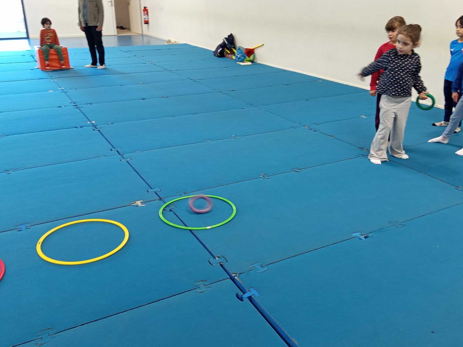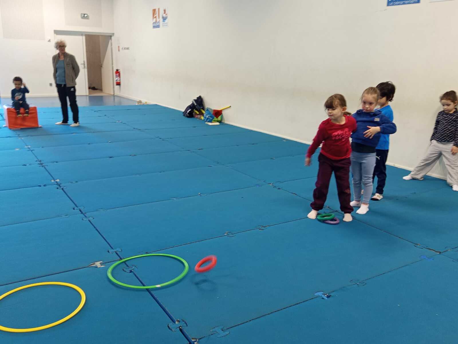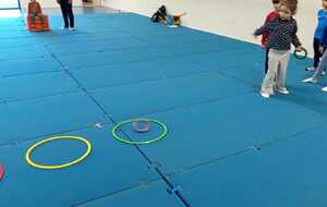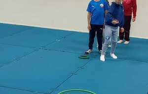 2ème atelier..le lancer. Il fallait lancer 3 anneaux dans 3 cerceaux espacés le 1er ..1 point. 2 ème ..2 points. 3 ème.. 3 points. Cela demandait adresse et coordination .