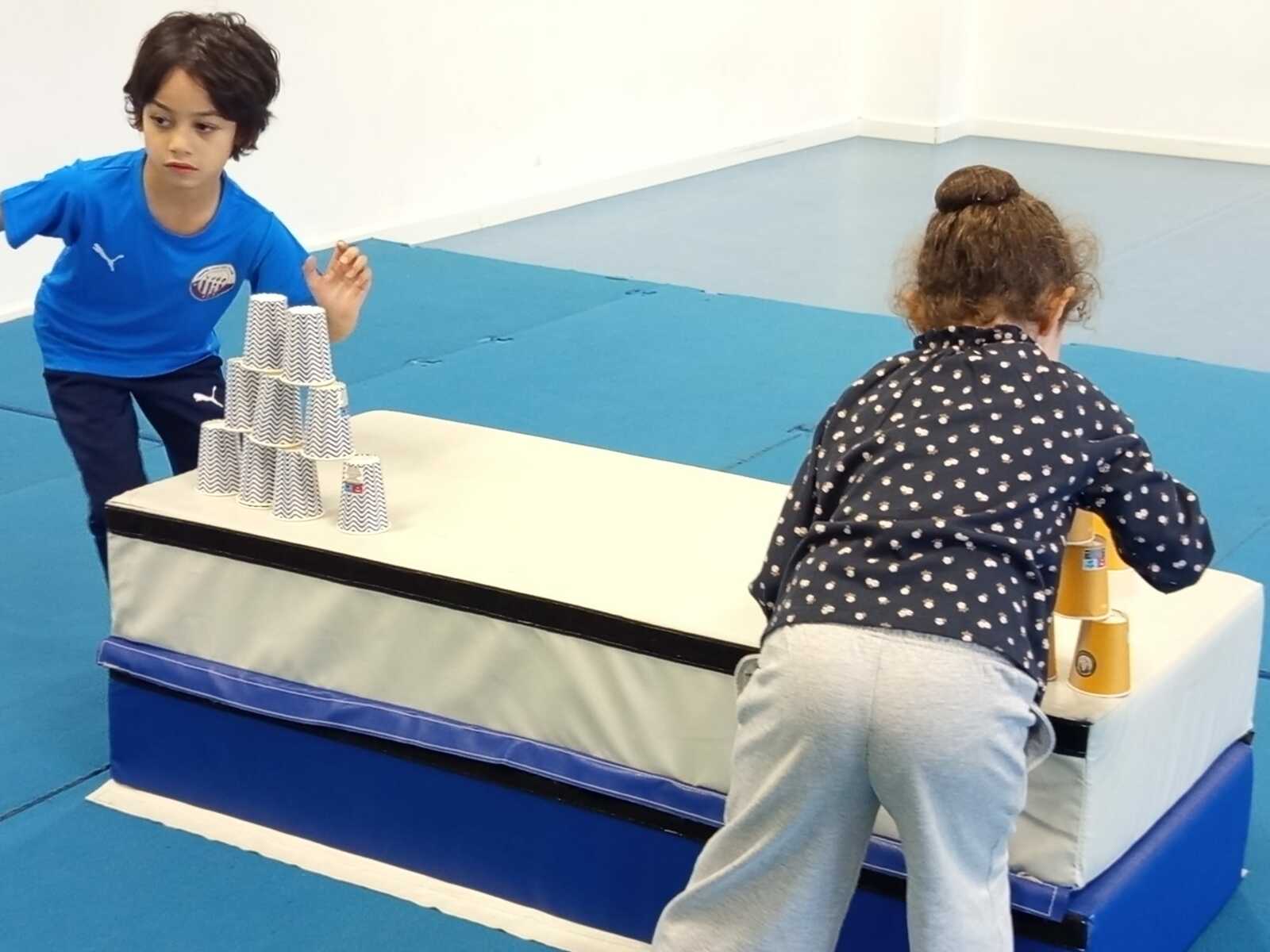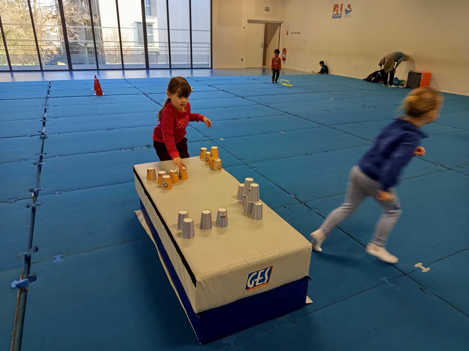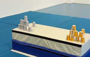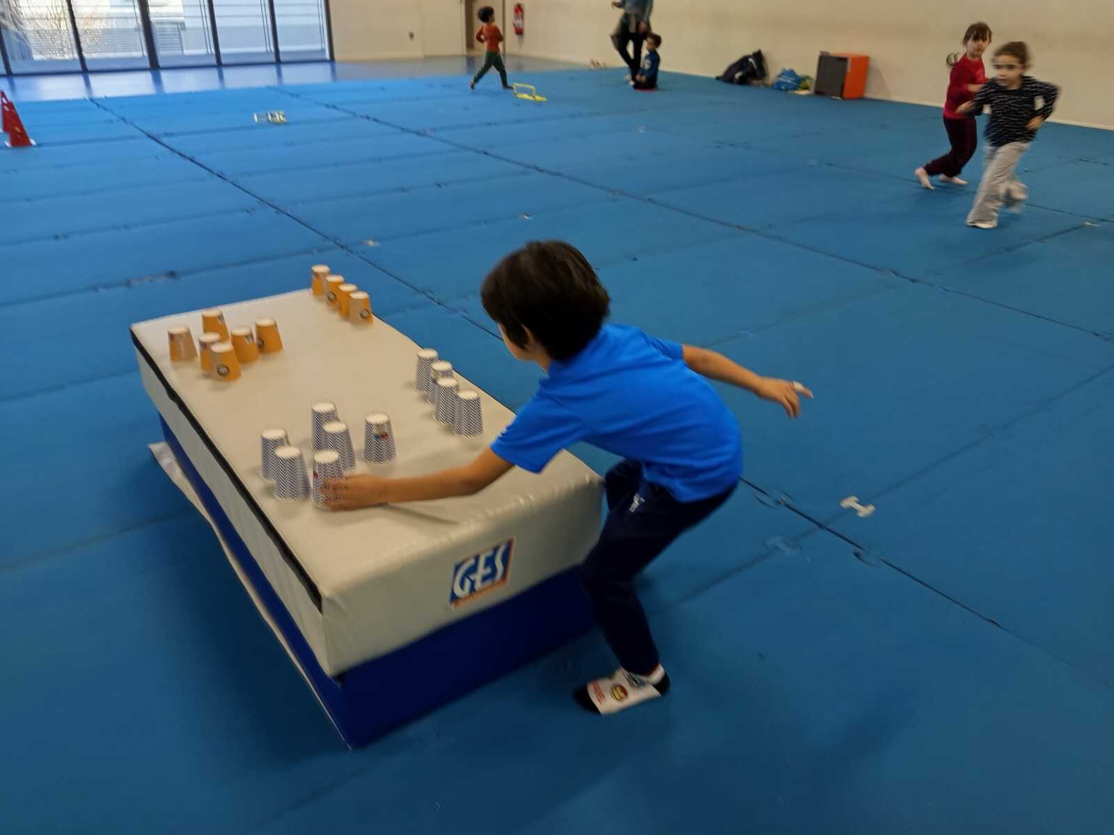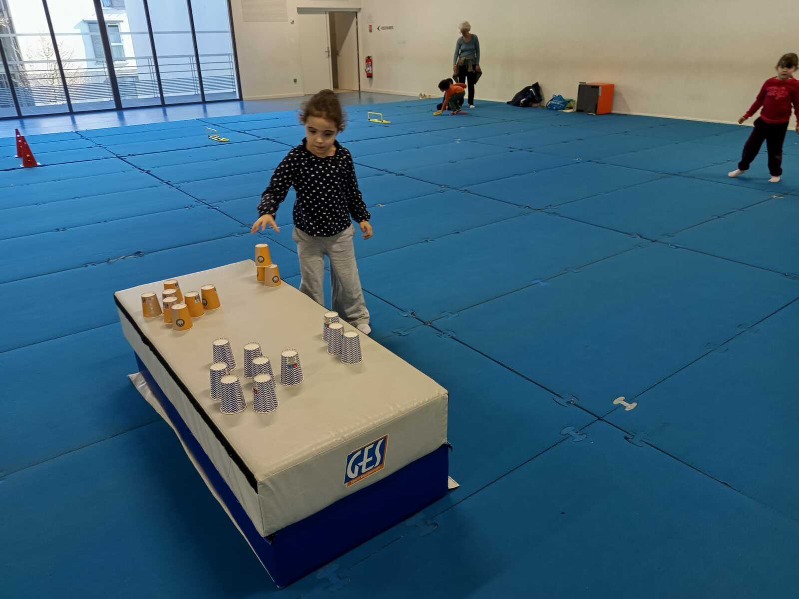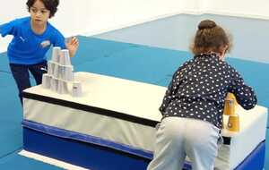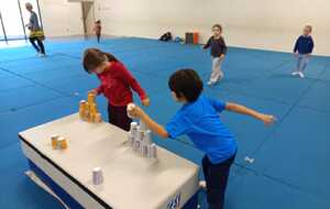 3 ème atelier....un relais. 2 petits groupes, il fallait le plus rapidement possible faire chaque groupe une pyramide ..4.3 .2.1 à l' aide de timbales disposées en vrac sur un tapis haut. Au top signal le premier de chaque équipe partait et disposait une timbale puis le 2 ème la 2 ème timbale et ainsi de suite jusqu'à ce qu'une équipe finisse la 1 ère et remporte 1 point.le relais a été fait plusieurs fois .