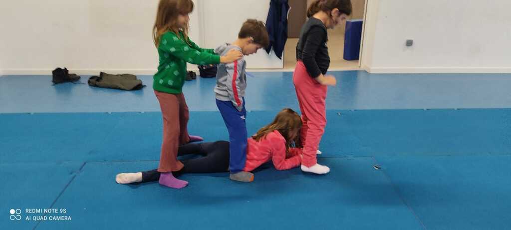 4ème et dernier atelier : le pont roulant, chacun à son tour de passer entre les jambes de copains ou copines qui sont l'un derrière l'autre, les jambes écartées le plus rapidement possible et se placer devant pour réformer la colonne .