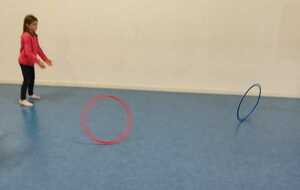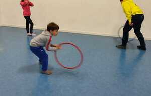 2ème atelier : lancer de cerceau ...face à face ils se lançaient le cerceau au sol du mieux possible afin qu il ne dévie pas, afin que celui d'en face puisse le récupérer et le renvoyer de la même façon ...aïe aïe !! pas facile à réussir car le cerceau partait dans tous les sens mais quelque fois quand même il y a eu de la réussite !