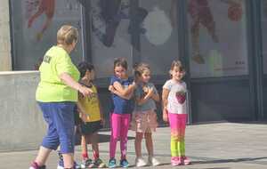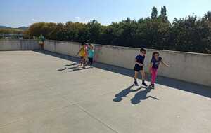 3 eme atelier : le relais. 2 équipe de 3 avec en face et espaces 5 cerceaux.Au top départ donne par Loan le 1er de chaque équipe partait en courant prenait le 1er cerceau le passait de la tête au pied, laisser sur place le cerceau et partait jusqu'au 2 ème cerceau et faisait de même et cela jusqu'au 5 ème, puis partait en courant vers son équipe tapait la main du 2ème qui refaisait le même parcours et cela jusqu'au dernier de l'équipe. La premier equipe qui finissait marquait 1 point