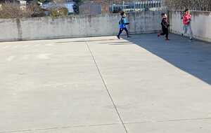 2ème atelier...relais coupelles : 2 petits groupes. Au top départ de Loan chaque 1er devait partir en courant et devant eux à une certaine distance il y avait un plot avec un jalon et à côté un cerceau avec des coupelles, chacun devait prendre 1 coupelle du cerceau et l'enfiler au jalon et vite repartir taper la main du 2ème qui a son tour de faire pareil et cela jusqu'à ce qu'il ne reste plus de coupelle dans le cerceau. Le 1er groupe qui terminait marquait 1 point. Cela a été fait 4 fois pour améliorer leurs scores.