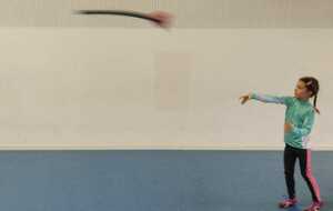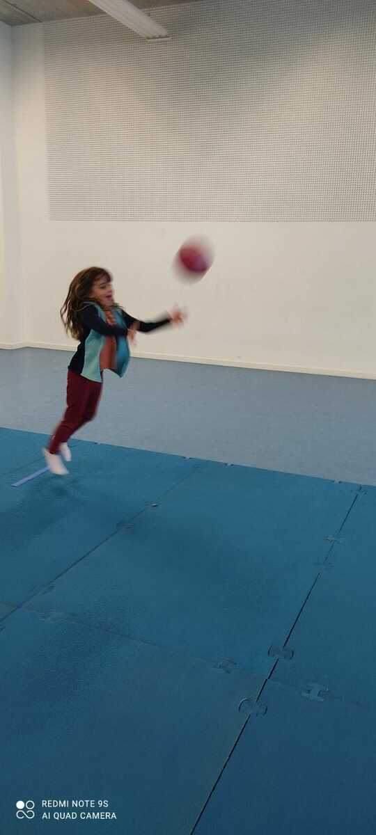 2ème atelier le saut de grenouille avec lancer de ballon en même temps le plus loin possible.