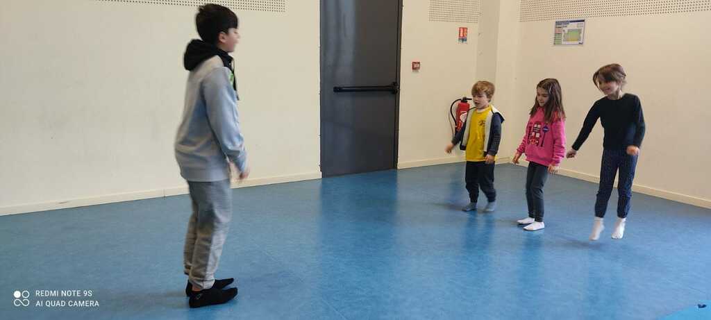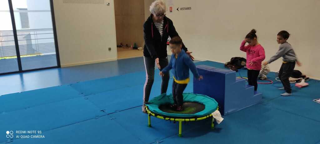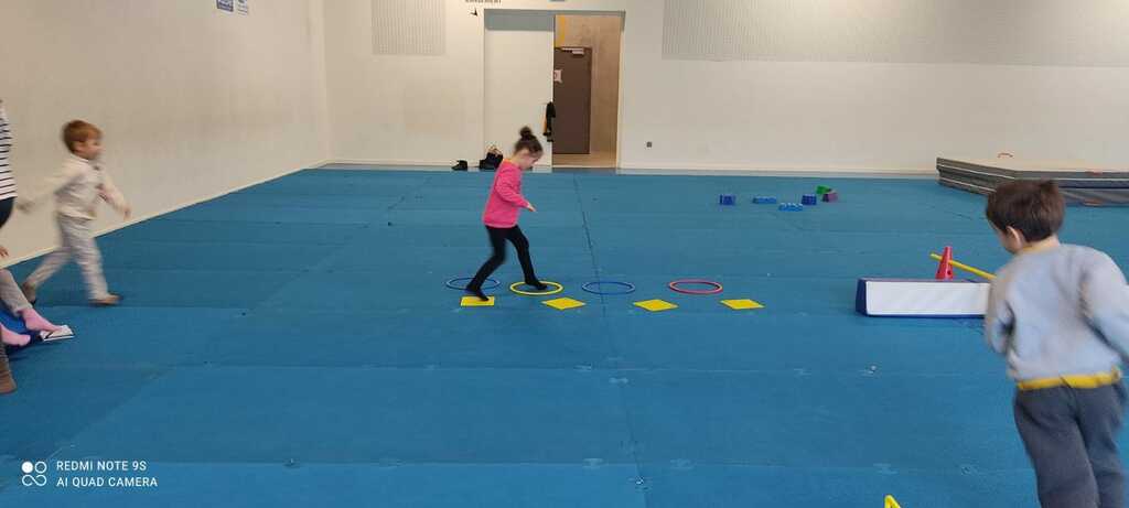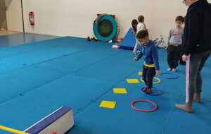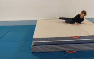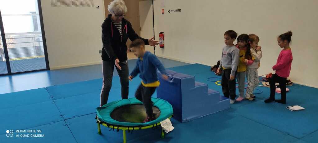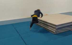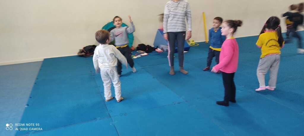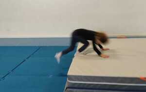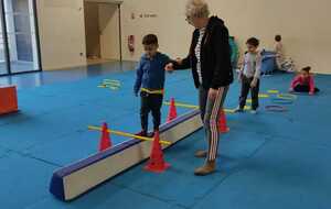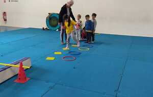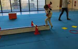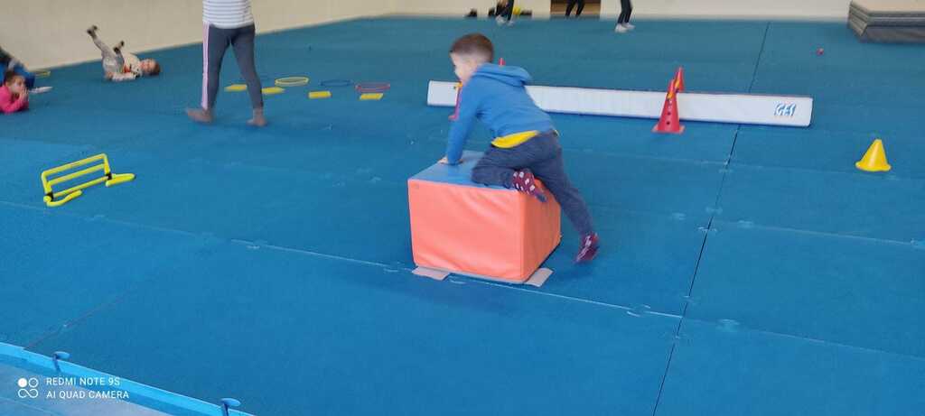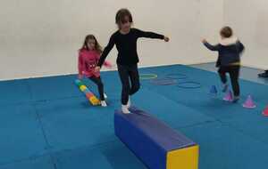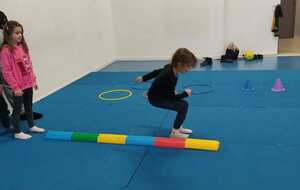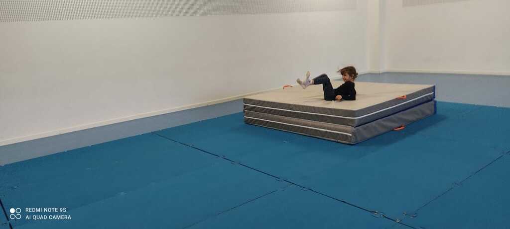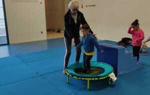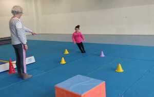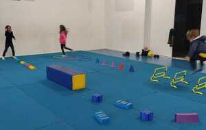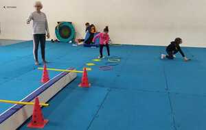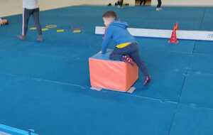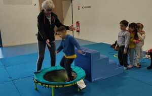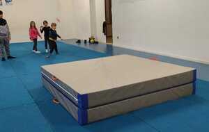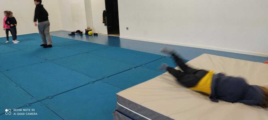 3ème atelier : sauter sur un haut tapis ...initiation au saut en hauteur . Là il s'agissait en prenant de l'élan de courir et sauter de n'importe quelle manière sur le tapis et pour une variante ils ont même réussi à sauter et faire une roulade . Ils ont tous apprécié ce nouvel atelier où ils se sont tous défoulés.