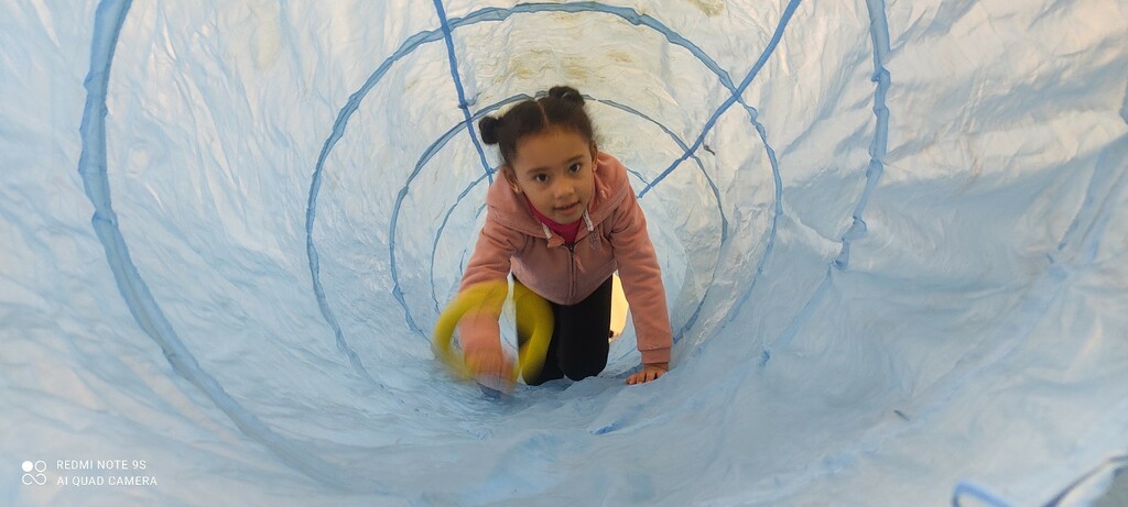 Le 3ème atelier en commun était un relais avec passage dans le tunnel bleu . Au top départ le 1er des jeunes partait le plus vite possible avec un anneau à la main, passait dans le tunnel et après avoir contourné le grand plot rouge, il devait courir et passer le relais au deuxième et cela jusqu'au dernier...pour pimenter le jeu nous avons chronométré et l'avons fait 3 fois pour aller de plus en plus vite et gagner qelques petites secondes et même 1 mn au dernier tour