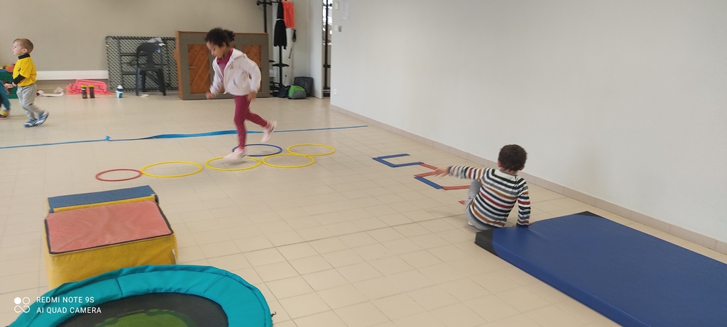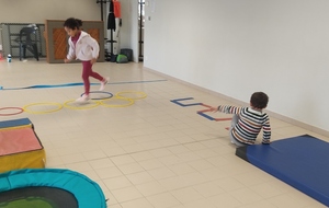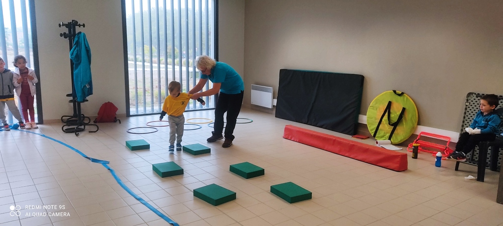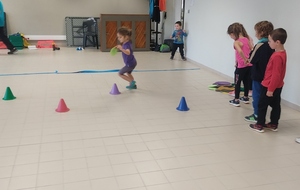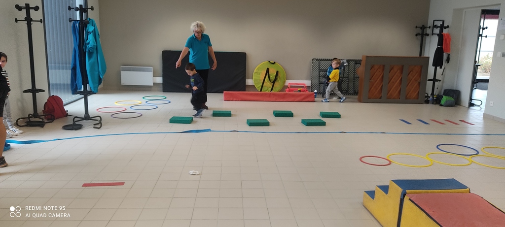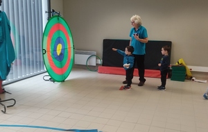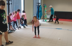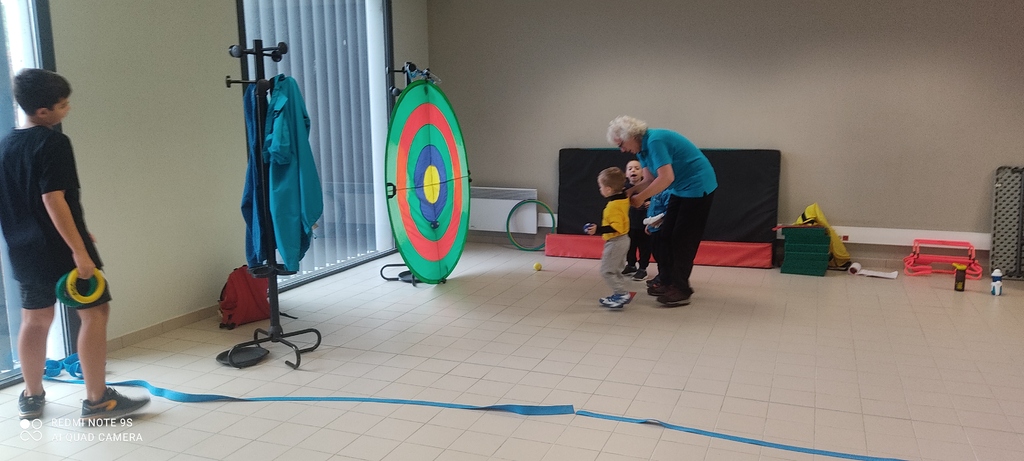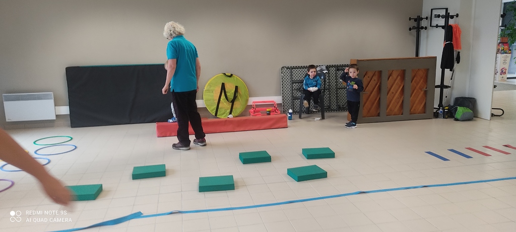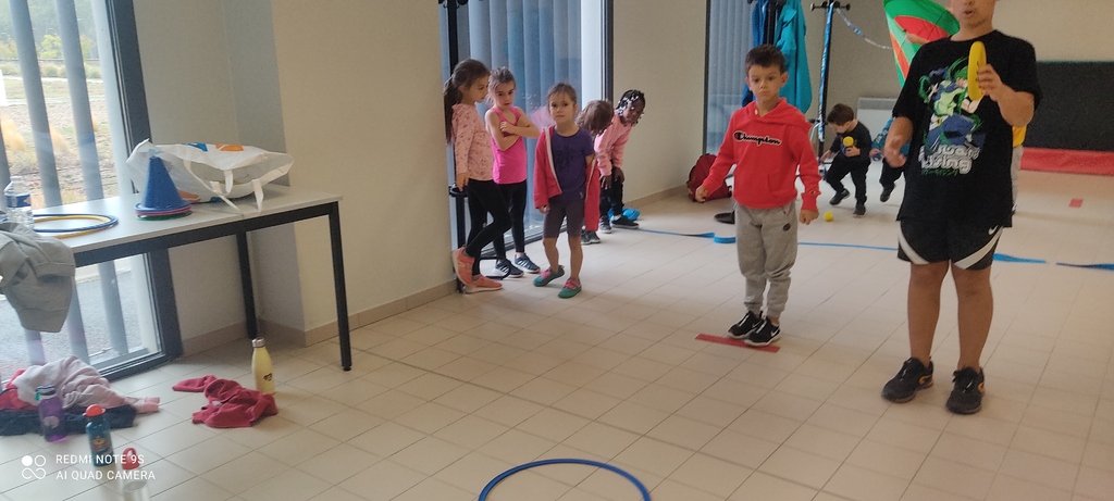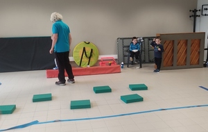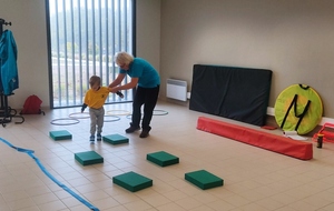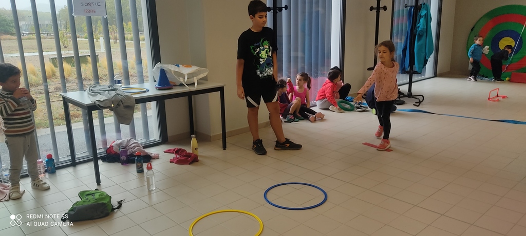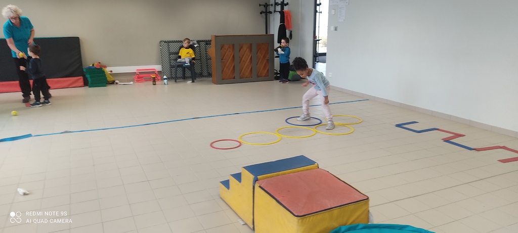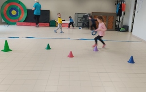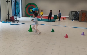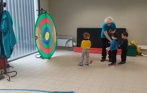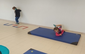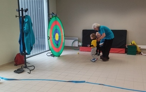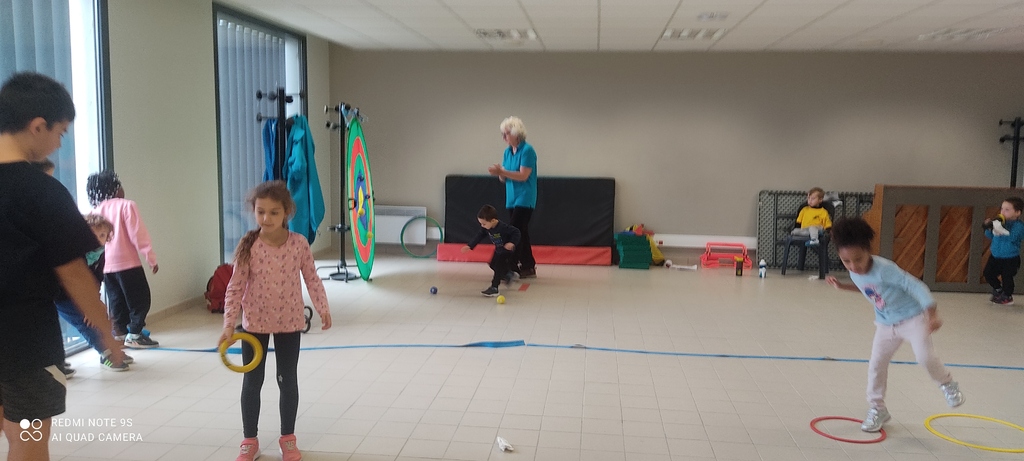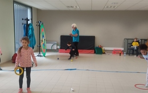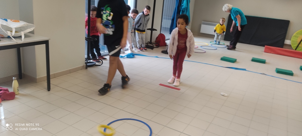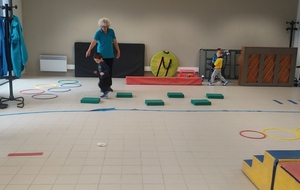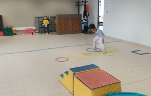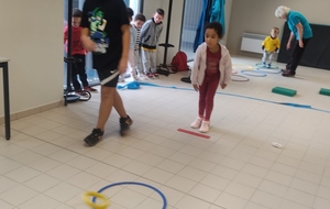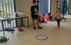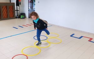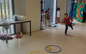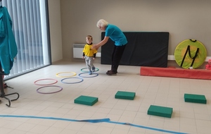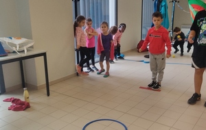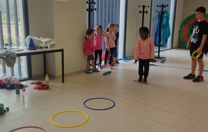petit parcours ludique avec moi et 2ème atelier : lancer d'anneaux dans cerceaux avec Loan en interchangeant nos groupes afin que tous fassent les 2.