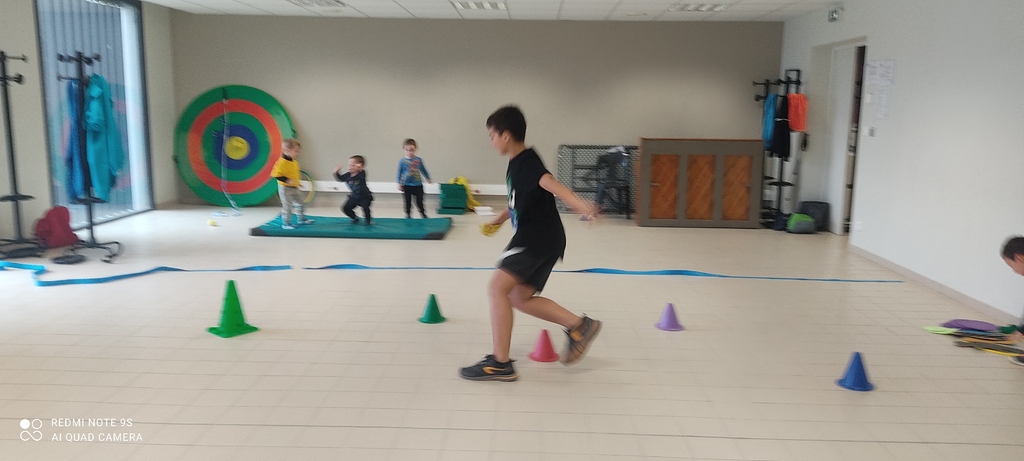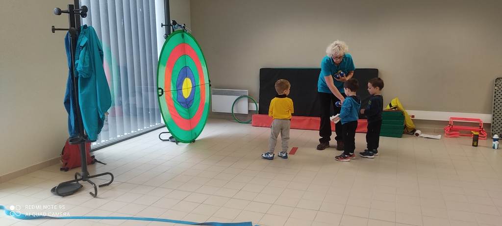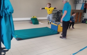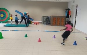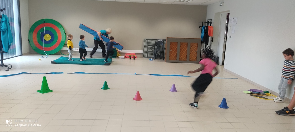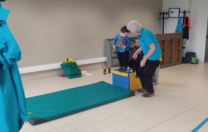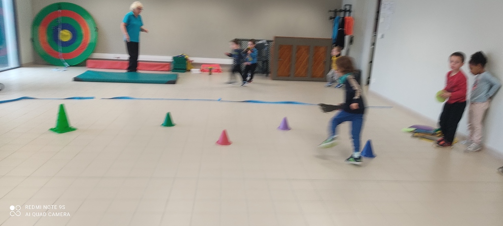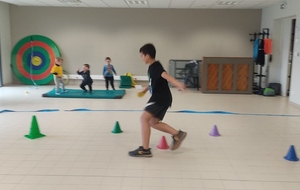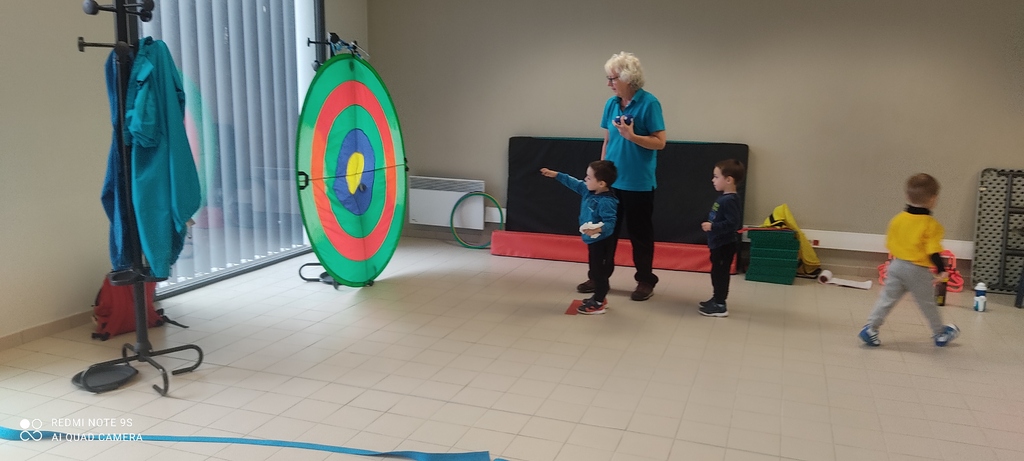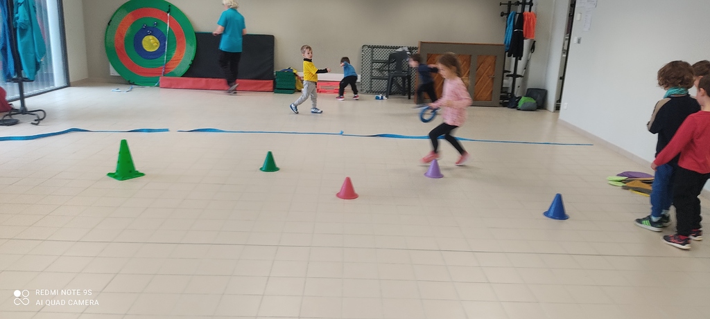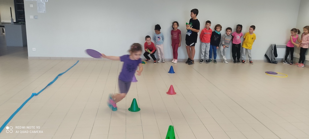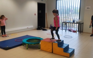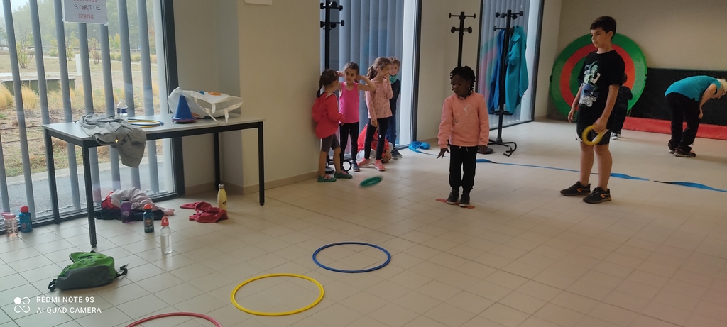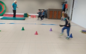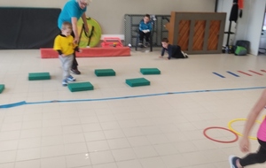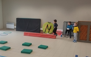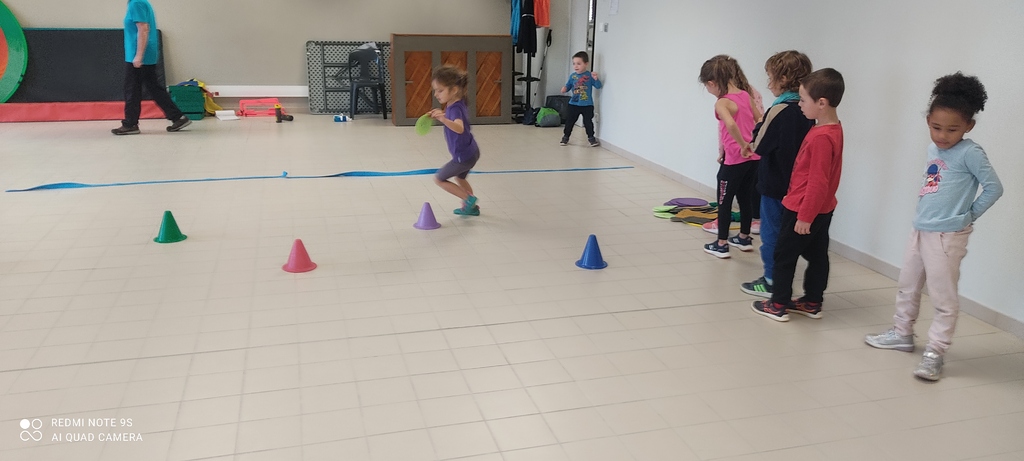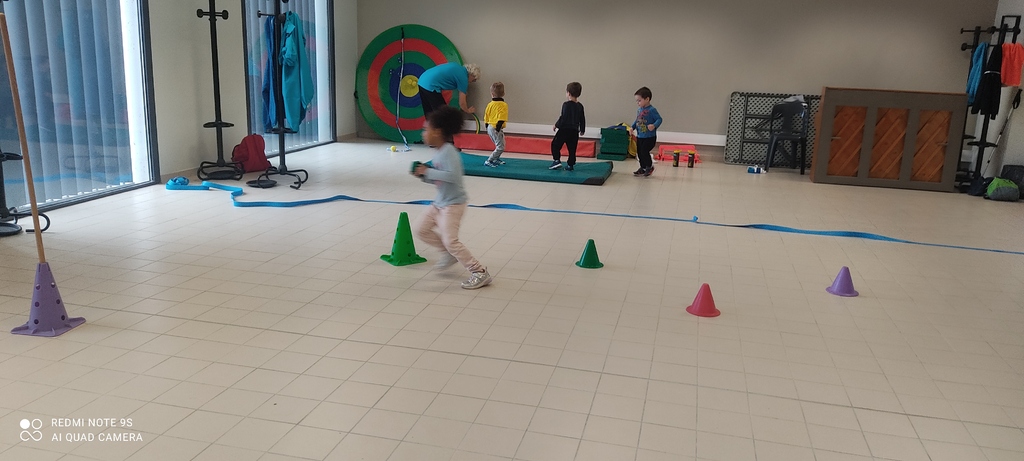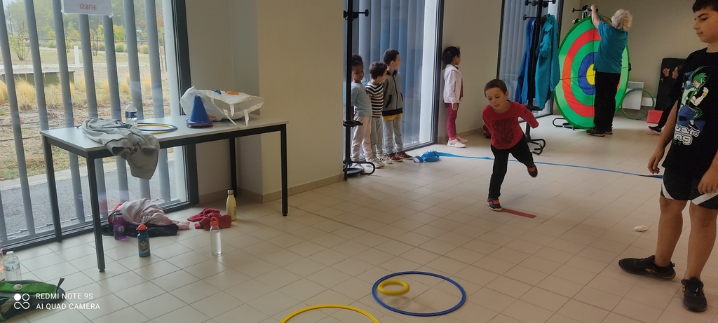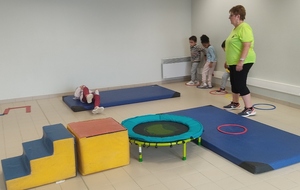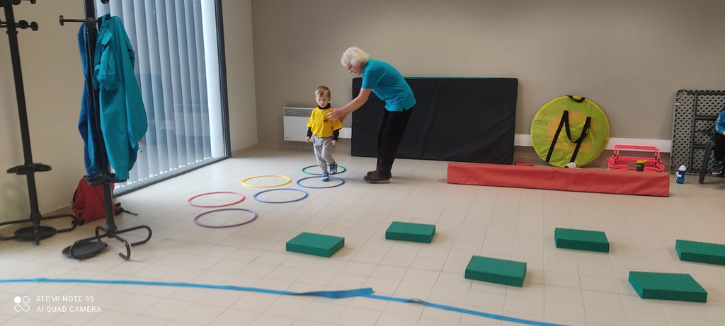 petit parcours ludique avec moi et 2ème atelier : lancer d'anneaux dans cerceaux avec Loan en interchangeant nos groupes afin que tous fassent les 2.